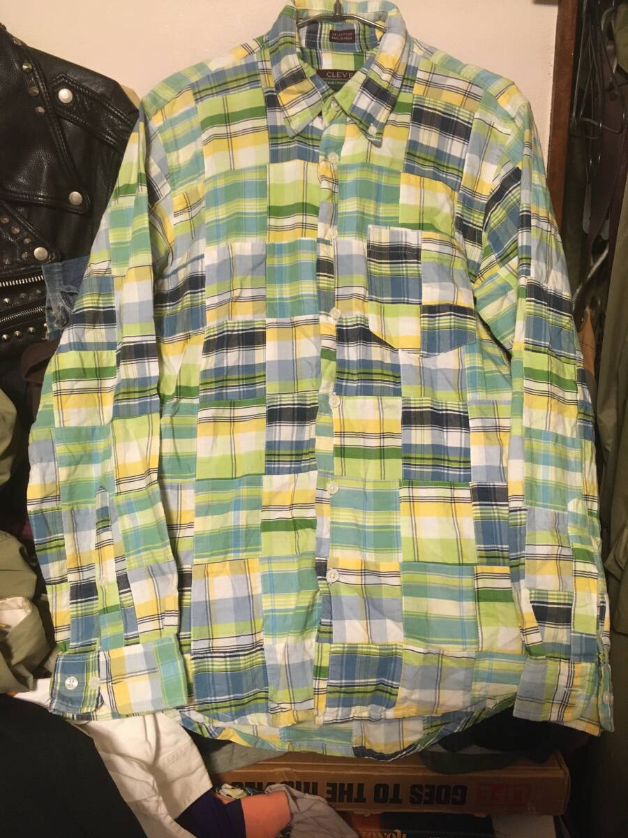 2208インドINDIA製CLEVEクリーヴ クレイジーCRAZYパッチワーク マドラスチェックB/Dボタンダウン シャツXSマルチUSEDパネル古着