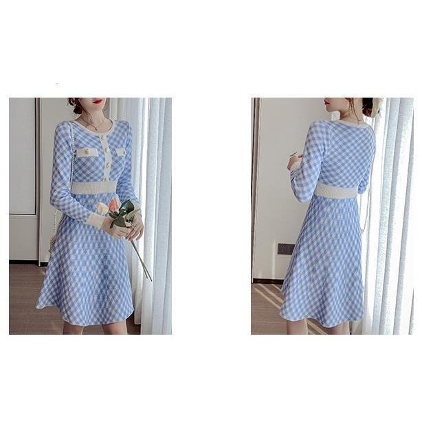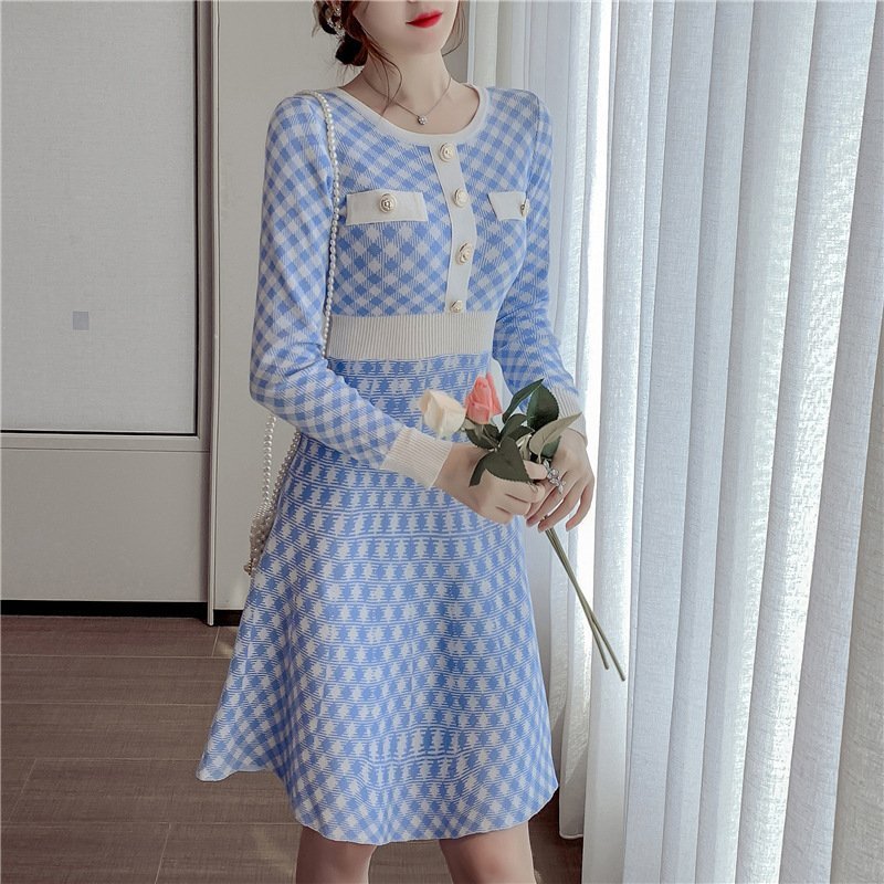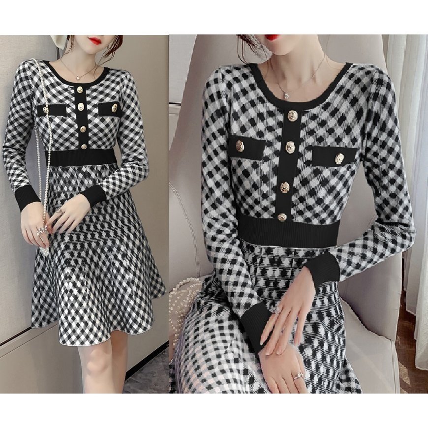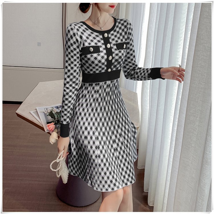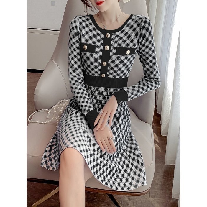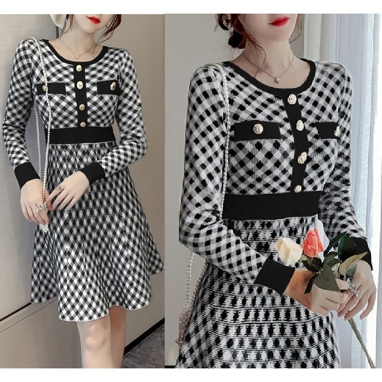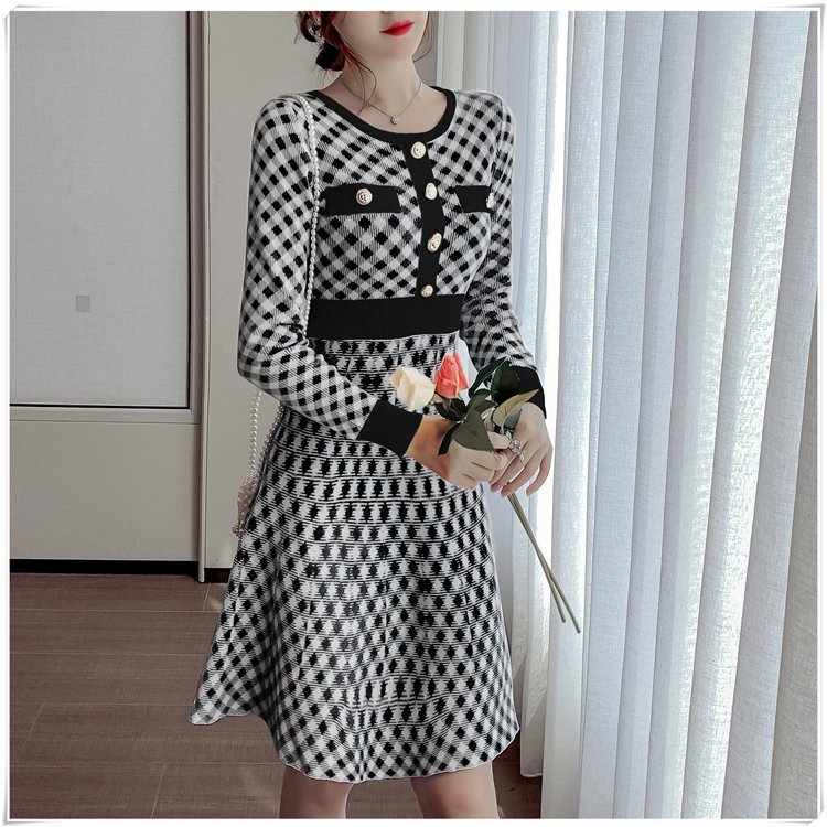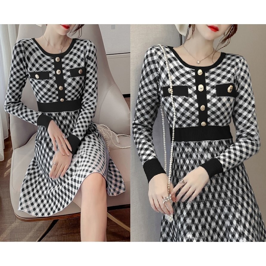 しっかり生地*ボタン付*総柄*チェック柄*ニット素材*Aラインフレアワンピースgyma1254