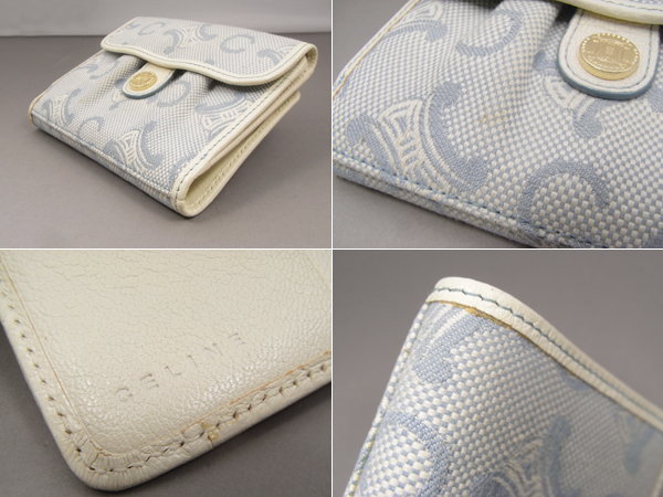 | 特徴 | セリーヌのダブルホック財布です。小銭入れ1、札入れ1、カード用ポケット9、ポケット4あり。コンパクトながら収納力タップリです。色は水色と白のコンビでとってもさわやか。女性らしい印象です。正面、ホック下に5mm程のしみあり。 | ||