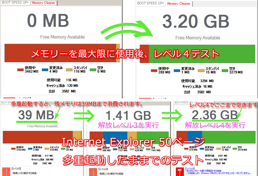 他社ソフトウエアでは出来ない「究極に」メモリー解放・最適化を搭載しています。 ・メモリ解放レベルはレベル1~4 (弱から最強)までありますので、お好みに応じて使用できます。 ・また搭載されている「メモリークリーナー技術」は 1つ・1つ違う「8つの手法」を織り交ぜております。 ・最大解放レベル4はページメモリ(ページファイル)までも実行中に解放できます。 解放・最適化対象は沢山ありますが、ザックリ抜粋しますと ・起動中アプリケーション ・起動中サービス(アプリ~ドライバーに至るまで) ・未使用の空きメモリ ・キャッシュメモリ ・スタンバイメモリ ・スワップメモリ、スワップファイル ■ メモリ詰まり解消後は、Windowsメモリ解放は正常動作するようになります。 ■ 巨大なファイルのコピー後に、スワップが発生してWindowsの動作が遅いとき場合でも一発で解消します。(レベル3で) ■ Windows使用中にメモリが足りなくなっても、使用中メモリから不使用/無駄な領域を探し出して解放しますので、 空きメモリを空ける事が可能です。 起動中アプリケーション、サービス、ドライバーなども、メモリ節約を考えずに製作されているのがほとんどで、 無駄にヒープ領域を取っております。 この無駄なヒープ領域からも空きメモリーを削り出しいたします。 本機能でWindows、各種アプリケーションがおかしくなることは一切ございません。 開発のきっかけは、かねてから疑問だったWindowsのメモリ管理 各種ソフトを全て試した結果、メモリ解放出来るソフトが1つも無い状況 調べに調べ、テストを繰り返し、かなりの日数・工数を掛けて、究極なメモリ最適化機能を作成いたしました 「他ソフトウエアのような、子供だましのような機能ではございません、本気でメモリ解放します。」 最大レベル4でメモリ解放を行った例です。 見事に使用中からページメモリ(ページファイル)まで全て解放出来ています。 ただレベル4は凄すぎるので、ページファイル設定をされている場合は、再確保のため若干ディスクアクセスが発生します。 ![]() ■ OS側の仕様上制約 Windows XPのみ、Memory Optimizer+のレベル4の一部機能(ページメモリ解放)は動作しません。 |