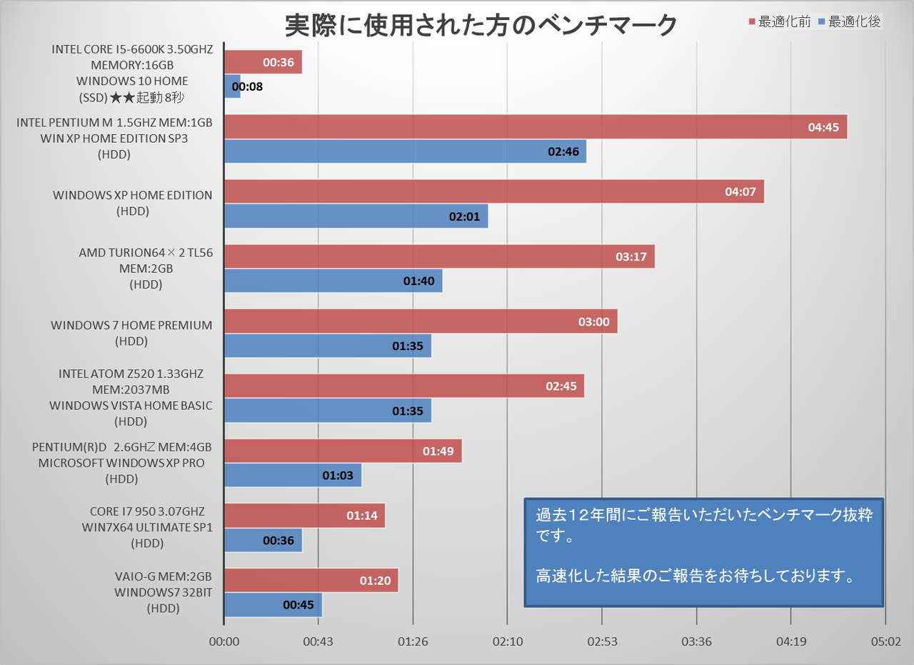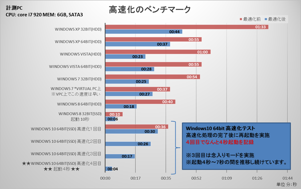 Windowsの起動速度、操作を速くする高速化機能 Windowsは長期使用、Windowsアップデート、各種ソフトのインストールなど、動作、起動速度が遅くなります。 この現象は最新OS Windows 11 でも改善されておりません。 Windowsの起動シーケンスを改善・最適化して、起動速度のスピードアップが体感出来るプログラムです。 タスクバーの表示がなかなか出てこないので、イライラすることは無いでしょうか? ●購入当時は起動も速かったのに・・・どうにかならない? ●起動速度がもっと速くならないかな? と言う方に! 高速化処理を実行しますと、タスクバーの表示などがログオン直後に即時表示されるようになり、快適になります。 システムの起動時間を向上だけでなく、高速化処理の副産物としてアプリケーションの実行速度を速くさせることもできます。 シャットダウン時間が半分なった、インターネットエクスプローラーがサクサク動く、との報告も多数頂いております。 他社高速化ソフトReady Boost、マッハドライブ、eBoostr PRO、驚速 シリーズ全種など どの様な高速化ソフトを使用中でも、更に高速化します。 他ソフトウエアのような子供だましのような機能ではなく、本気でWindowsの高速化処理をします。 また常駐しませんので、安心して使用できます。 開発のきっかけは開発者自身のPCが遅くなり、市販のソフトを使ってみたのですが、どのソフトを使っても高速化されない現実 動作を確認すると子供だましの様な機能、よくこんなものを・・・・以下略、 では、自分で高速化処理出来る物を作ってしまおうと、6ヶ月掛けて作成したソフトウエアとなります。 フリーウエア、シェアウエアにない、プログラマーが本気で作ったメーカーレベルのプログラムを一度ご使用なさってみてください。 きっと満足いただけるかと思います。 ■ 速度改善結果のベンチマーク 電源ONから、自動ログイン完了までの時間、最大9倍早くなっております。 特筆するのは、Windows 10 64bitでの高速化検証です。 お客様の報告で「高速化処理をするたびに速くなっていく!」とよく伺っておりますので、あらためて 新規 Windows 環境で検証いたしました。 ・2008年のCore i7 920機で試してみました。 ・リセット処理を実行 ・1回目の高速化処理で30秒の起動タイム、新規環境だからこのタイムと思います。 ・2回目の高速化処理で26秒の起動タイム、さほど変わりませんが、このタイムで満足される方も多いです。 ・3回目の高速化処理は念入りモードを実行、17秒の起動タイムと伸びてきました。さらに続けます。 ・4回目の高速化処理でなんと「最速の4秒の起動」を叩き出しました!すぐ立ち上がるのは何かの間違い?と思うくらいです。(2008年のCore i7機でですよ!) ※その後は4秒から7秒の間を推移し続けておりました。十分すぎる高速化を得られております。 ![]() ※この改善速度は実例ですが、PC環境により改善速度の上下有ると思いますので、上記速度を保証する物ではありません。 ■ 実際に使用された方のベンチマーク※下記にお客様から頂いた評価もご参照下さい。 使えば体感と好評いただいております。 ※本来計測方法は、電源ON~デスクトップを表示した瞬間までです。 ※下記計測方法はバラバラですが、デスクトップ表示の瞬間とするとほぼ2.4倍速、最近のは4.5倍速を推移しております。 ![]() ※この改善速度は実例ですが、PC環境により改善速度の上下有ると思いますので、上記速度を保証する物ではありません。 |