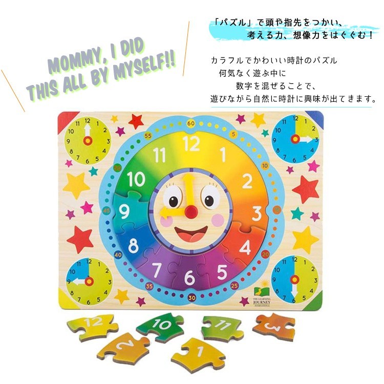 | 仕様 | 遊びながら楽しく時計と数字の学習が出来ます。 パズルで遊びながら、自然に興味が出てきます。 はじめは、絵と数字合わせで遊びつつ、 時計の針が動かせるので、ママやパパにお題をだしてもらって 時計(時刻)遊びも出来るよ! |