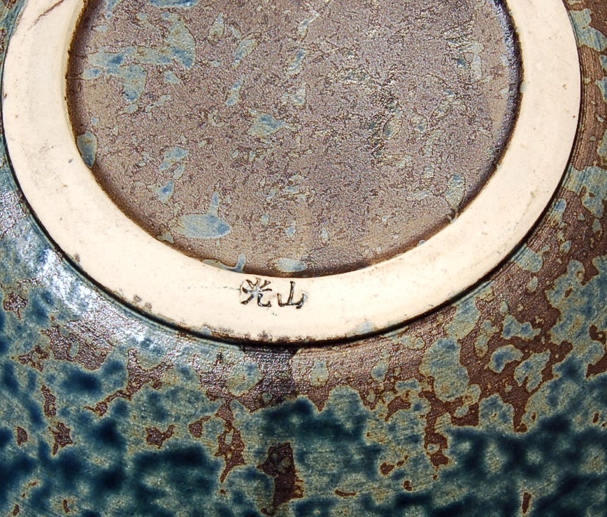 2個 花器 光山 水盤 平型:緑斑   土器風 素朴で味のある花器 真:在銘
