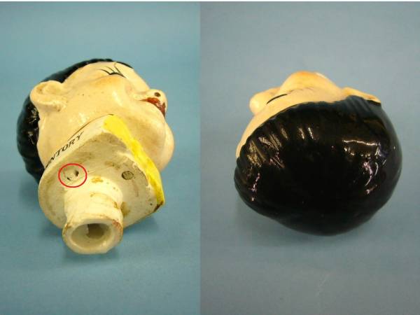 | 商品紹介 | 昭和30年代頃のものではないかと思われます。 お詳しい方にお願い致します。 陶製 コルクは朽ちて失われています。 写真のもののみです。 (写真は解り易いように複数の位置から写しています。1点の出品です。) (写真では実際の色が出にくい場合がありますが、ご了解下さい。) 気がついたものとして 後頭部に小欠けがあります。(写真1枚目枠内参照) 製造時による窯キズ、ホールが下部にあります。(写真3枚目枠内参照) 製造時によるコルク取り付けの接着糊の固まりが筒ホールにあります。(写真3枚目参照) 全体的に小キズ、スレ、塗料の落ちがあります。 中古品ですので経年の色褪せ、ヨゴレ、小キズ、塗料の剥落 製造時による型ムラ、凹凸、変色の部位、窯キズ、塗装ムラ 塗料の付着、釉薬のかかっていない部位などがあります。 雑器ですので製品自体の粗雑さがあります。 他にも難があるかも知れません。 その場合はご容赦下さい。 他に大きなダメージはないと思われますが 見落とし、書き落としもあろうかと思いますので 状態、欠品などは画像にてご判断下さい。 写真のものが全てです。 写真でご判断下さる様お願い申し上げます。 落札時に出品者からのメッセージが届きますのでご覧下さい。 (マイオークションの通知設定を非通知にしている場合は届きません) メールが届かない場合はお手数ですがご連絡下さい。 落札後のキャンセルはお受けできません。 |
