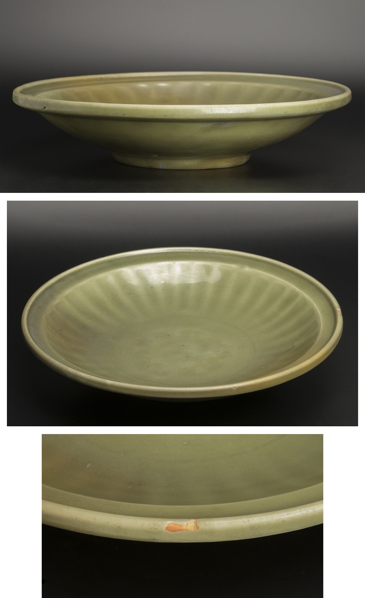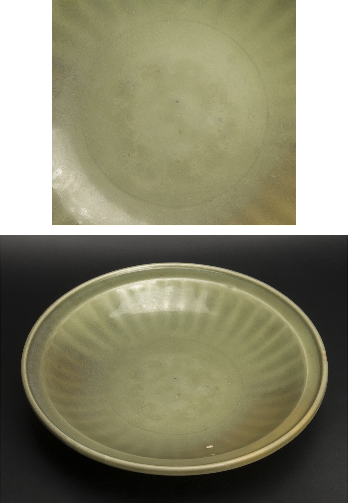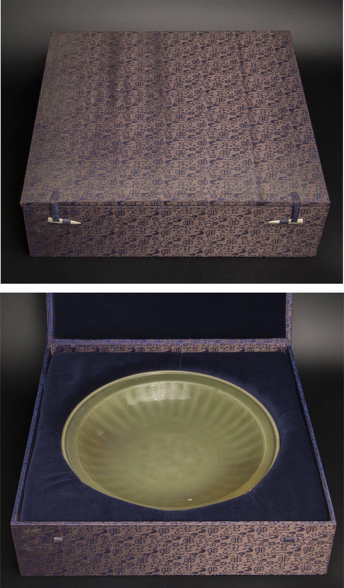明 龍泉窯 青釉暗刻花卉紋大盤 共箱 中国 古美術