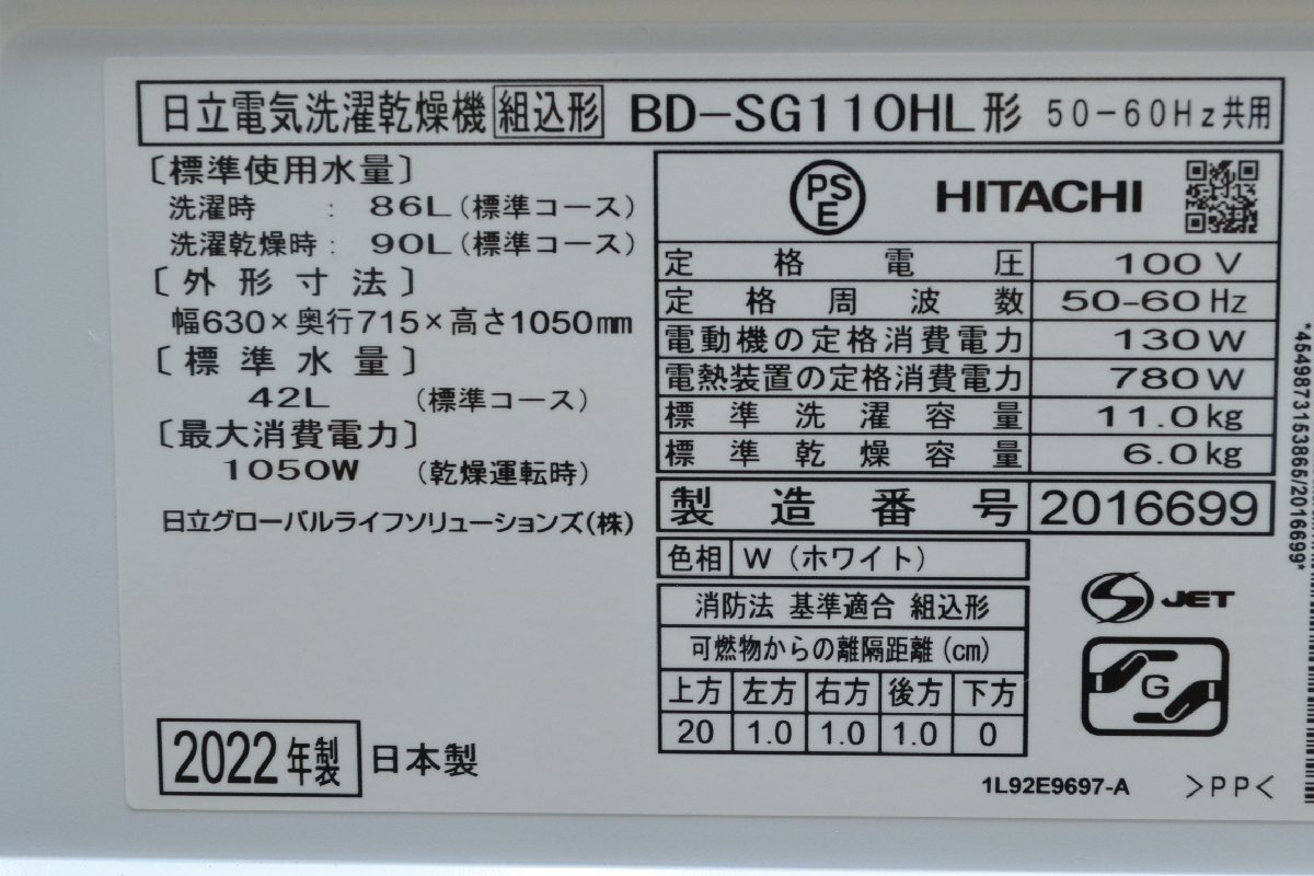 C2741■HITACHI 日立 ■ビッグドラム ドラム式洗濯乾燥機 電気洗濯乾燥機 (組込形) BD-SG110HL■2022年製■洗濯 乾燥 11.0/6.0㎏