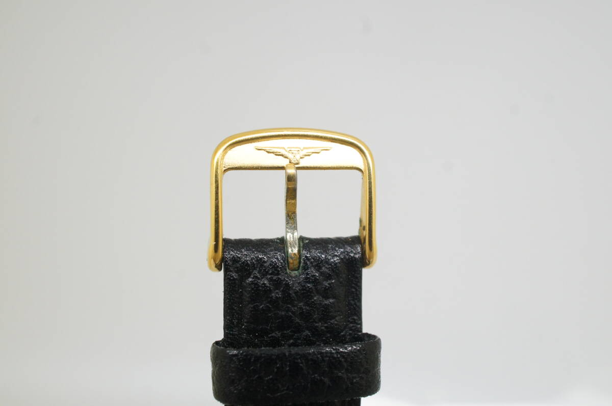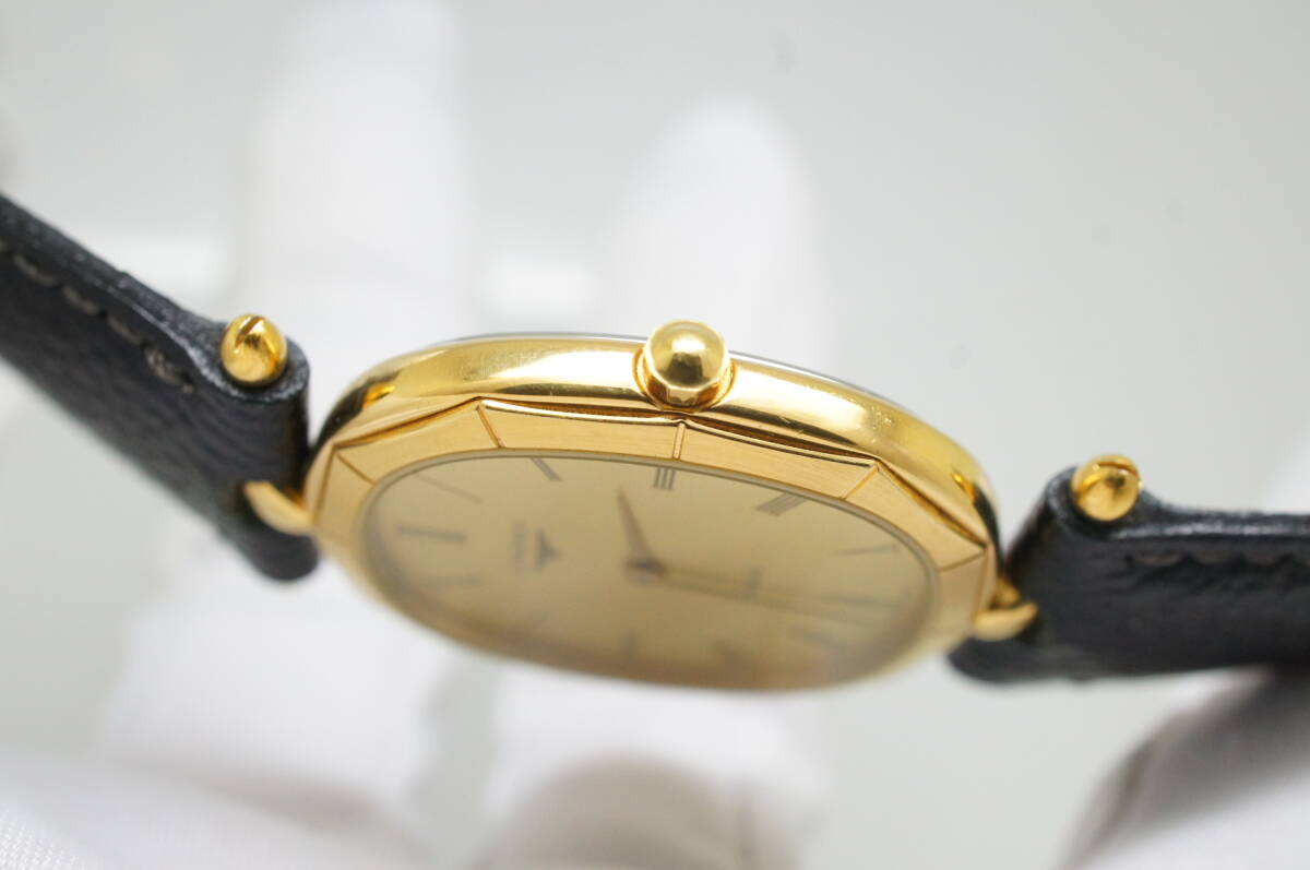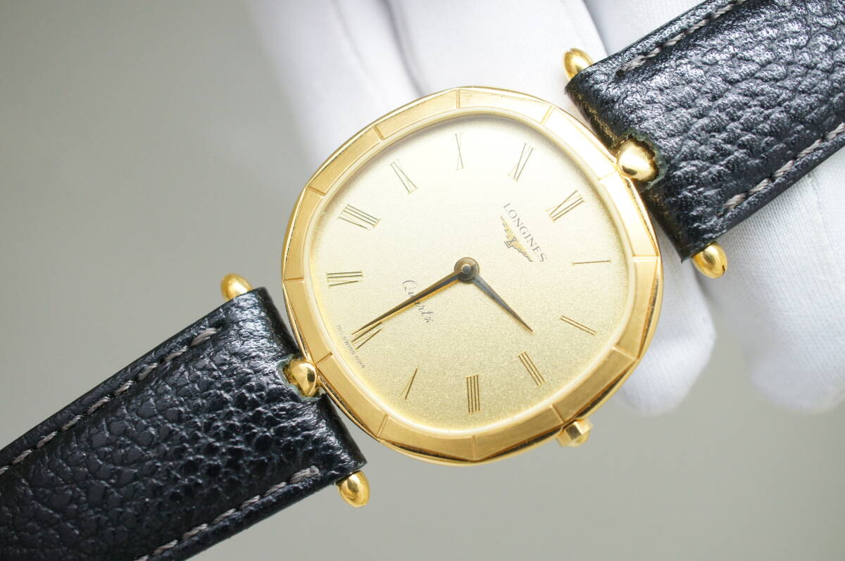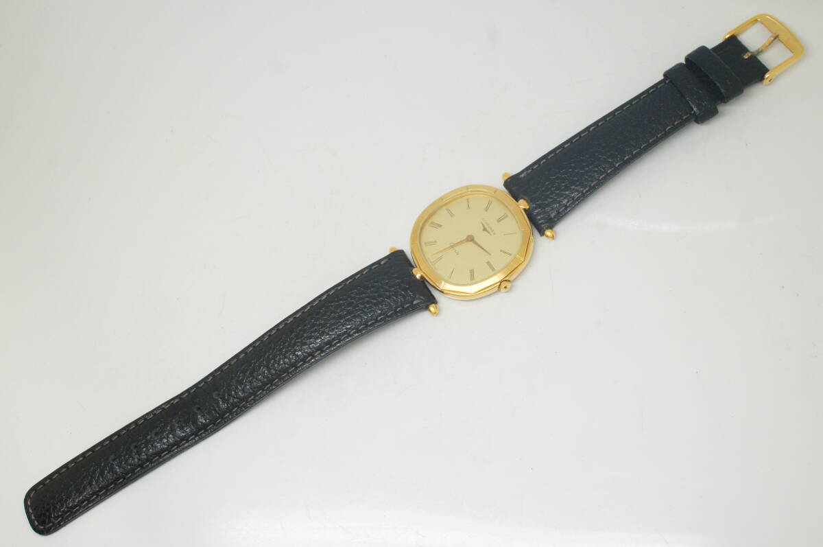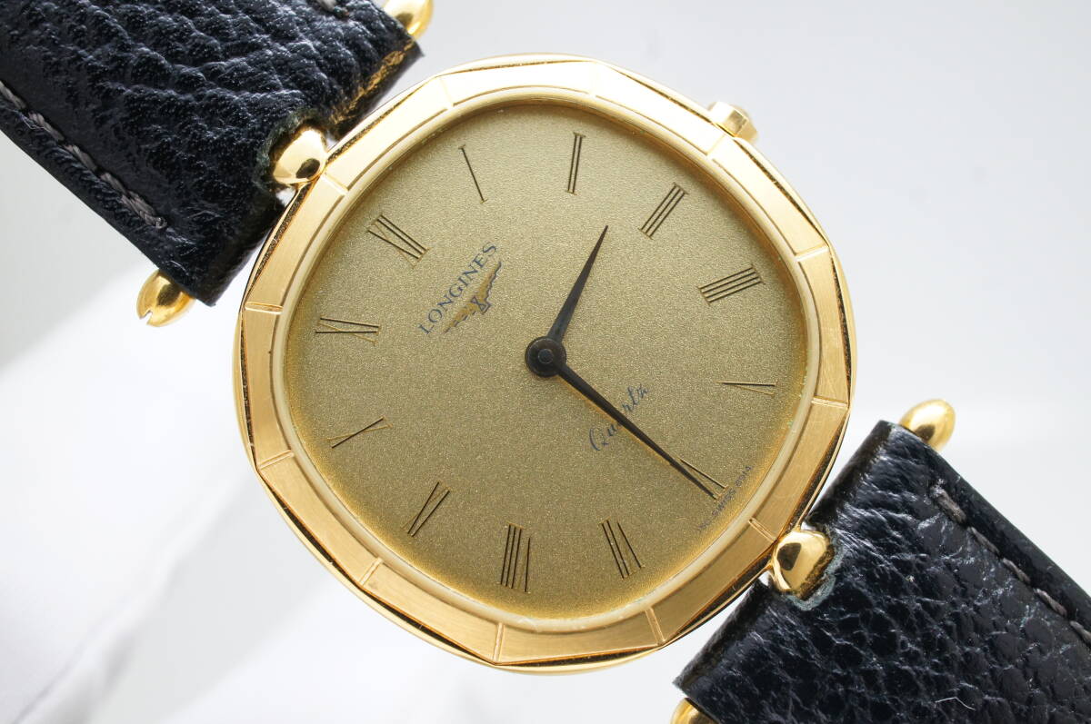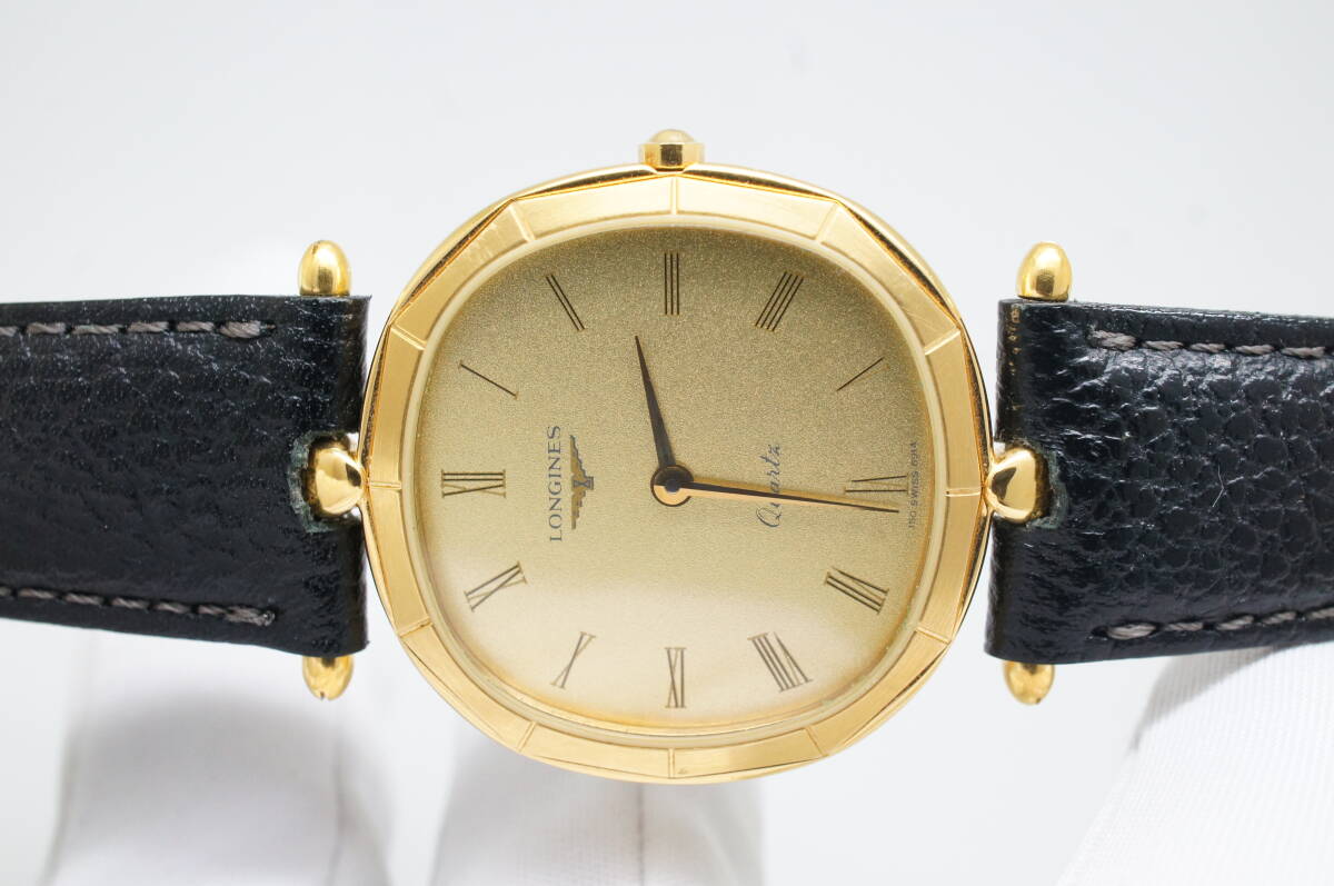 J121●作動良好 美品 LONGINES ロンジン L150.2 金文字盤 全ローマン数字 メンズ腕時計 ゴールド金×黒ベルト お洒落 クォーツ