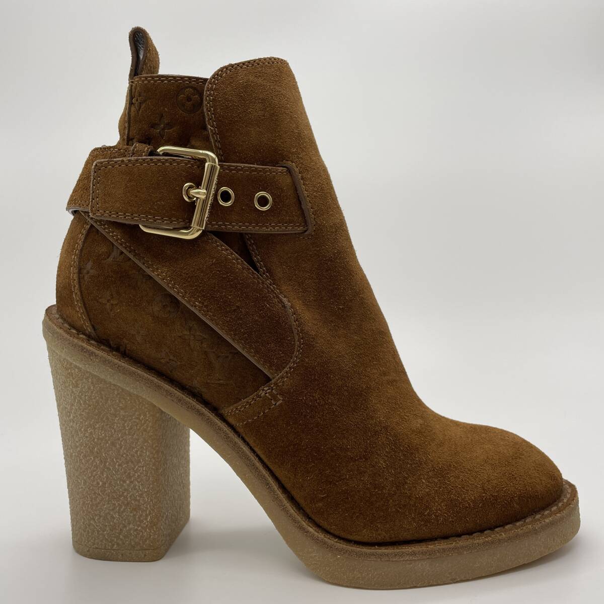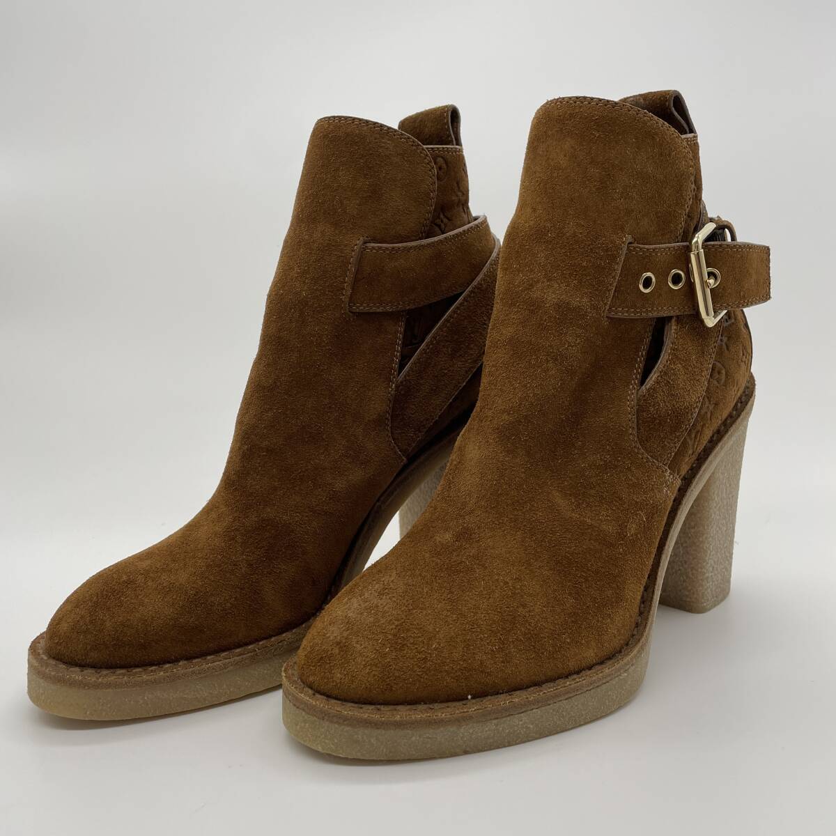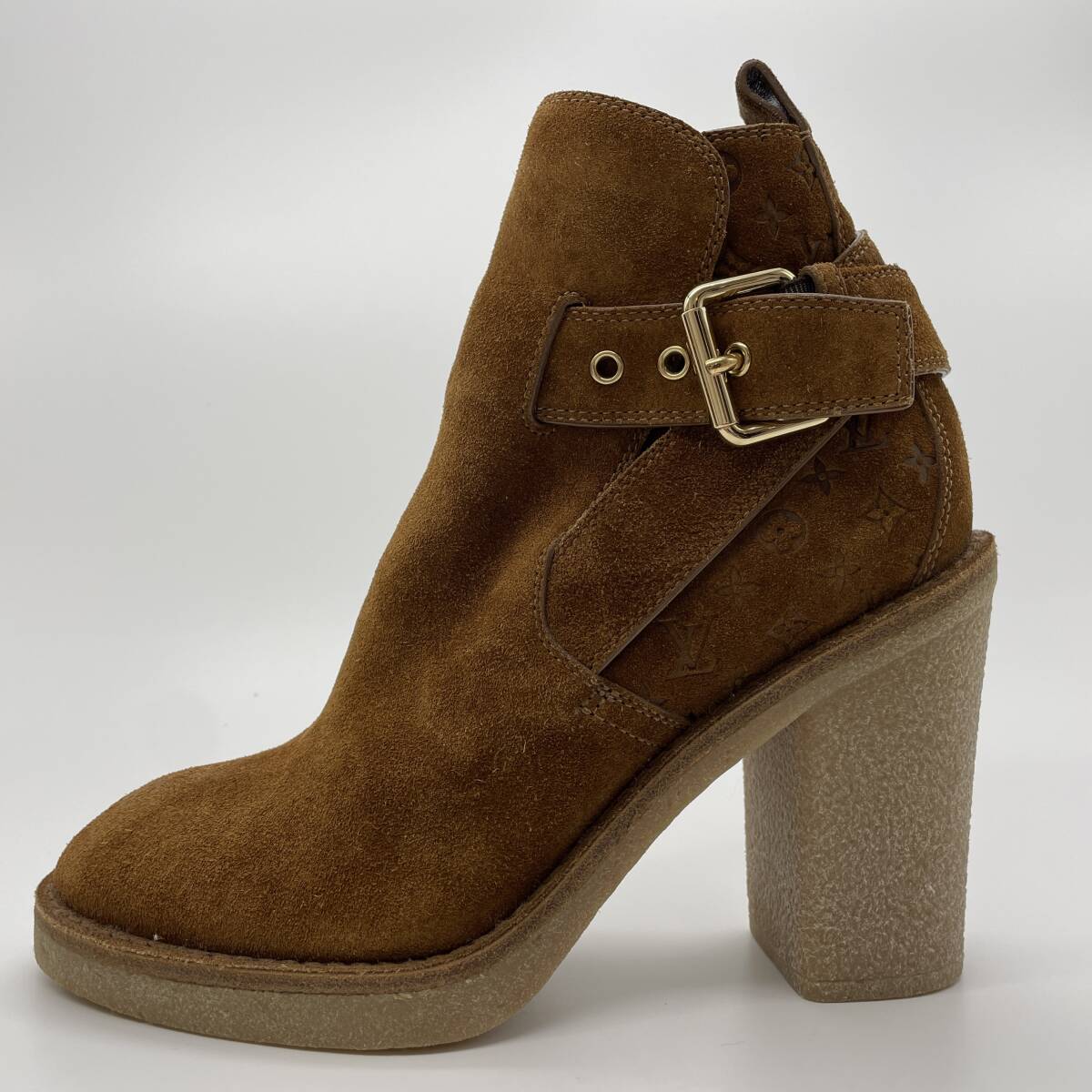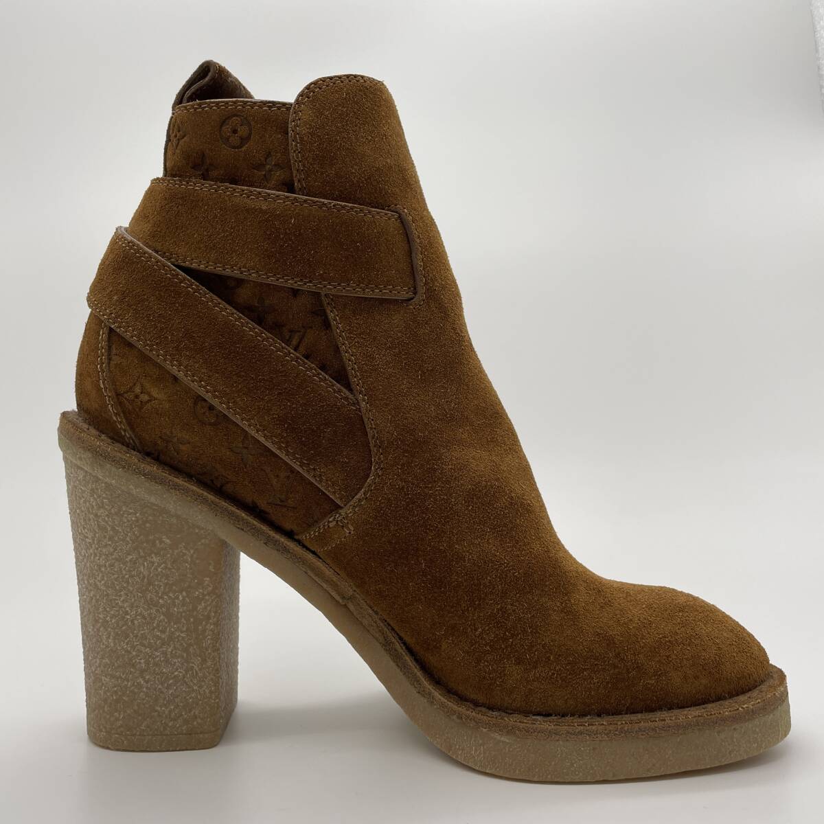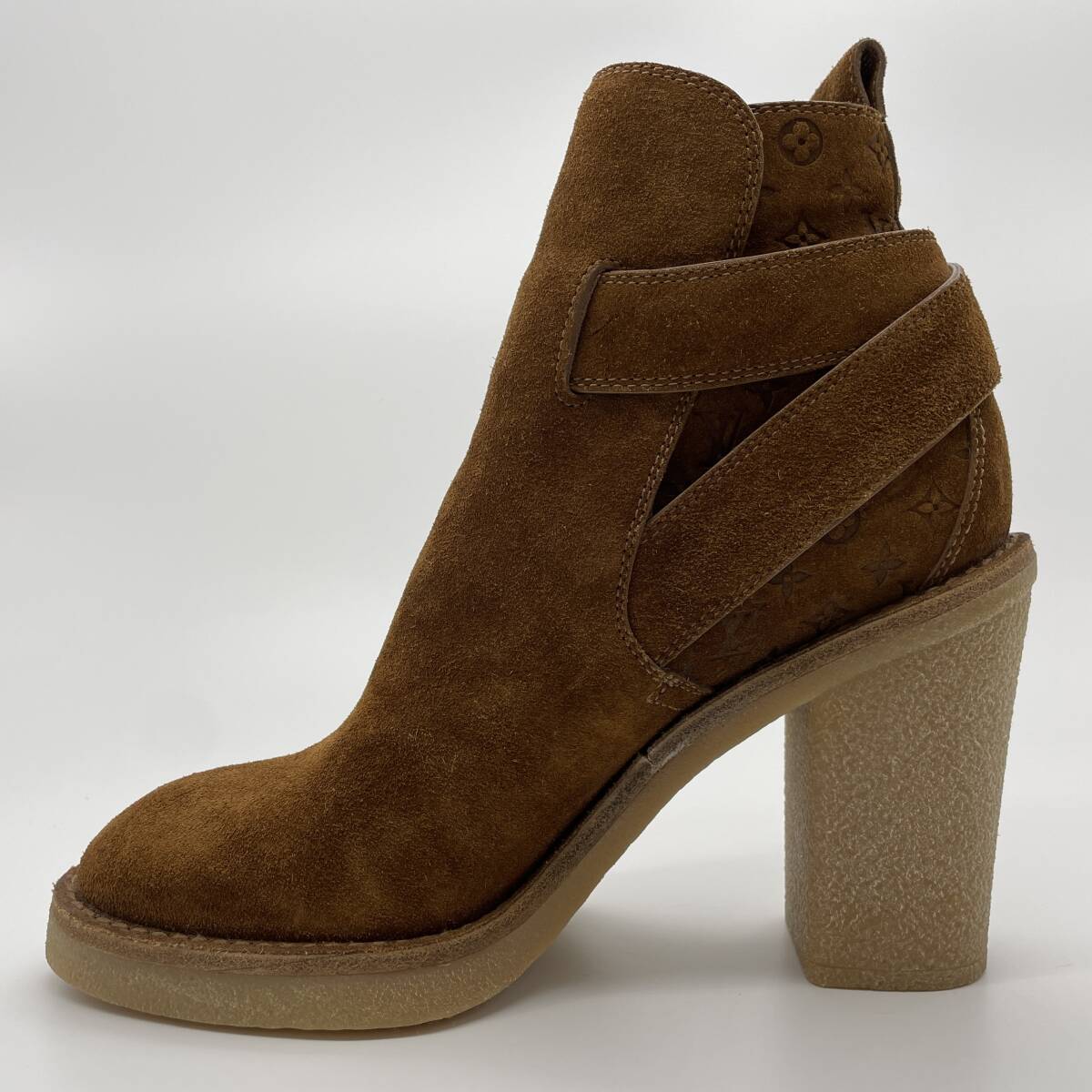 未使用品【LOUISVUTTON ルイヴィトン モノグラム アンクルブーツ スエードキャンバス レザー シューズ ヒール ブラウン レディース 34.5】