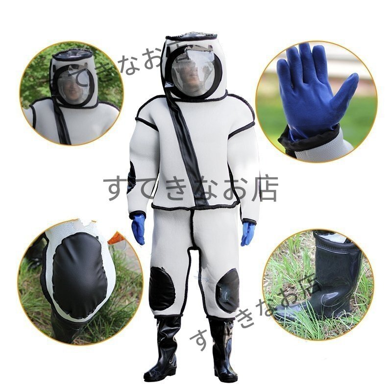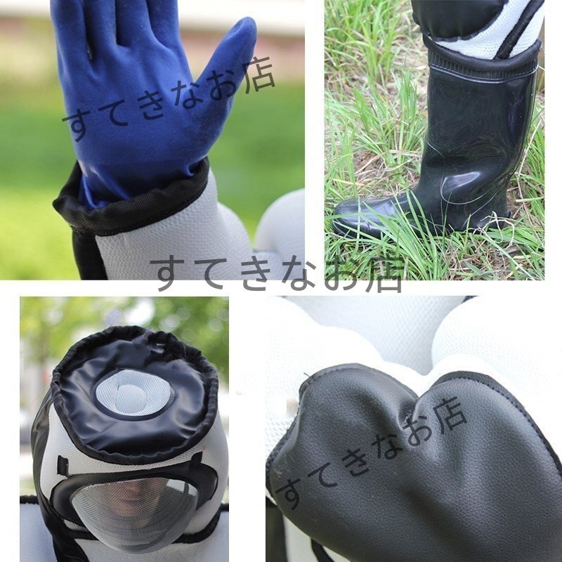 養蜂 防護服 ジッパー式 養蜂ジャケット フェイスネット付上下服 手袋 長靴付 M~XXL サイズ選択可 耐摩耗性 耐久性 5点セット