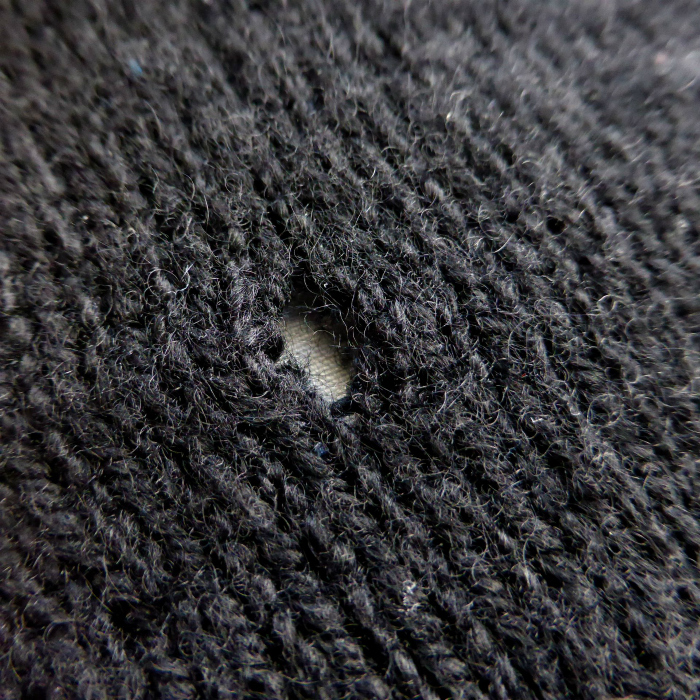 | 全体的に毛羽や毛玉、袖口に破れによるほつれ、左脇線あたりに破れが見受けられますが、まだまだお使いいただけるお品です。 |