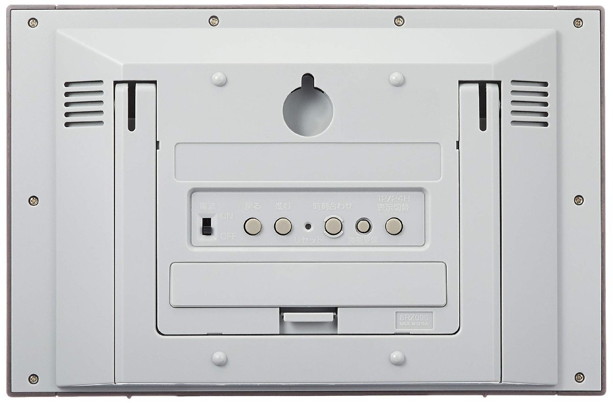 デジタルブラウン/157×240×40mm/8RZ096-023・パッケージ個数:1・サイズ:15.7x24x4cm・使用電源:単3形x2本(別売)・ムーブメント:電波時計 標準時刻電波を受信すると自動で時刻を修正します。・温度表示:(-9.9~50℃) 計測範囲以外はLL HH --と表示されます。・湿度表示:(20~95%) 計測範囲以外はLL HH --と表示されます。掛置き兼用デジタル時計。温度・湿度表示付。カレンダー表示付。サイズ157×240×40 (mm) 。重さ430g