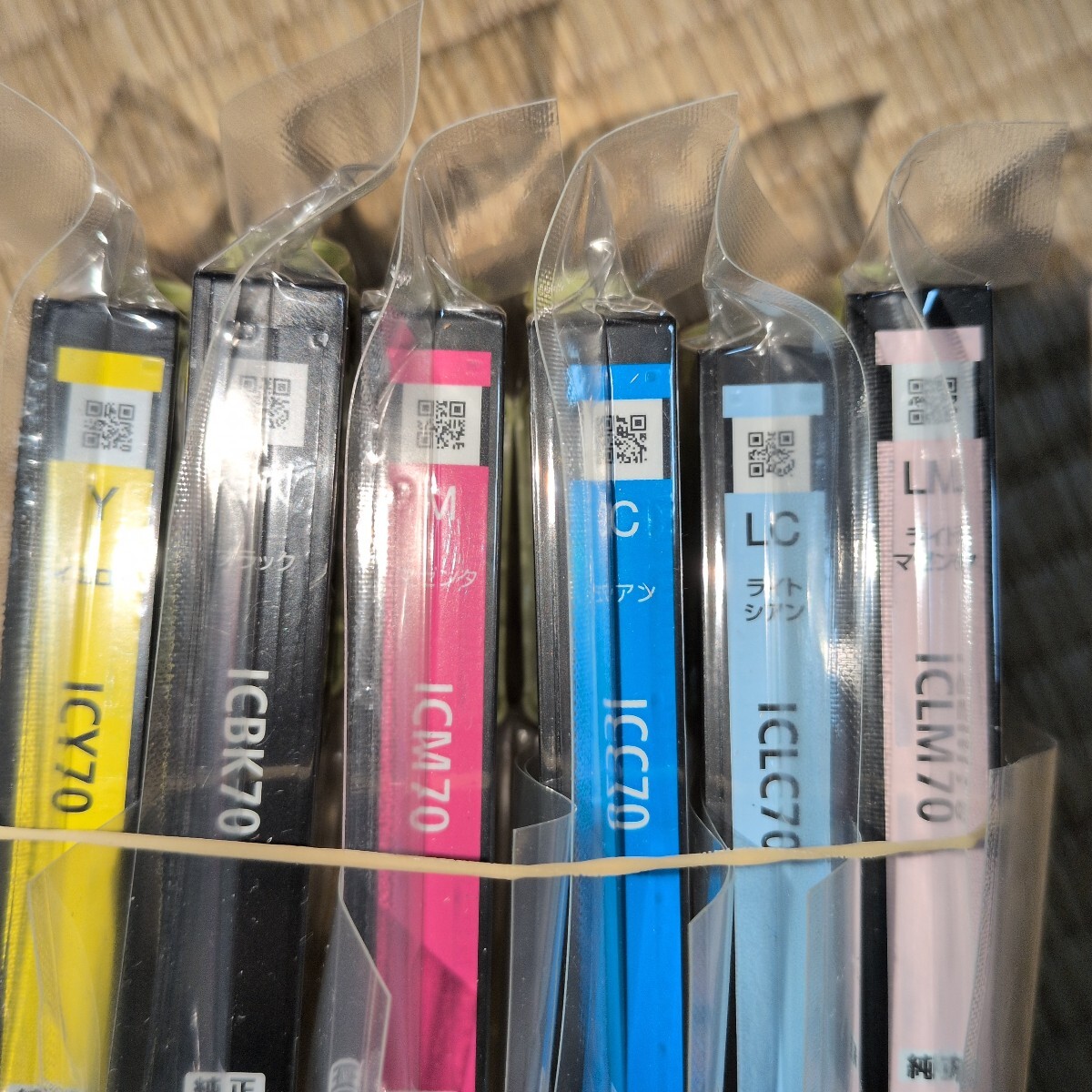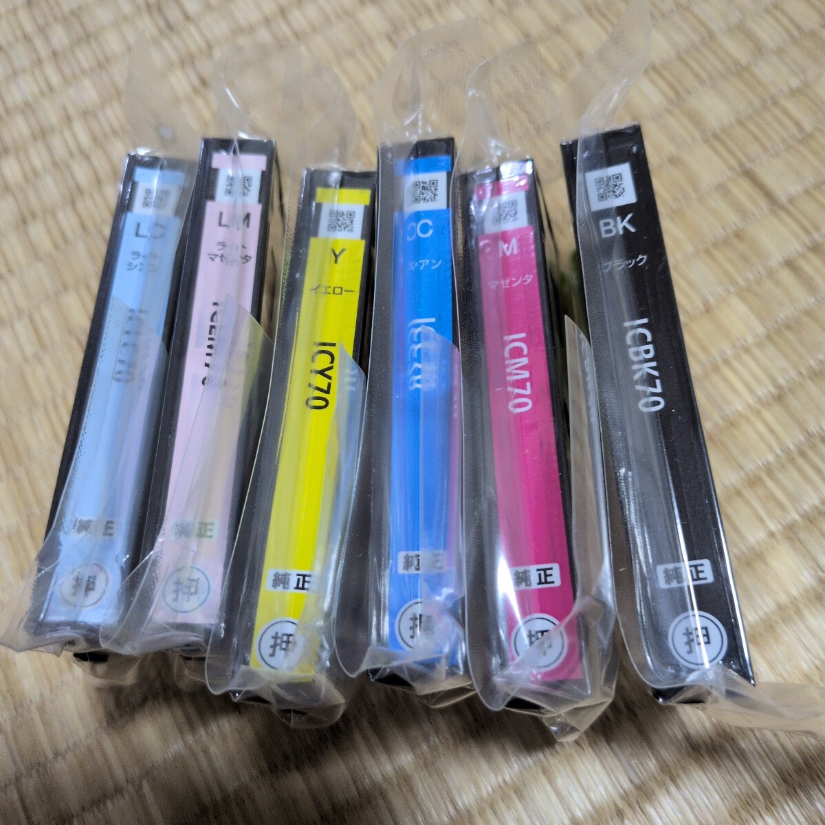 エプロン純正インクカートリッジです。箱無し 6色です。使用期限は不明ですが、切れていると思います。密封状況は、外から見た限りでは、密着しているので良好だと思います。ご理解のある方でお願い致します。不明な点はご質問お願い致します。