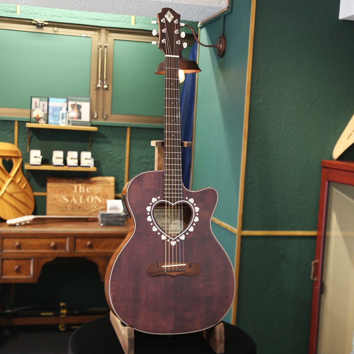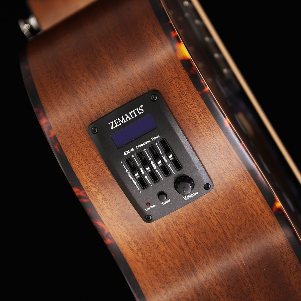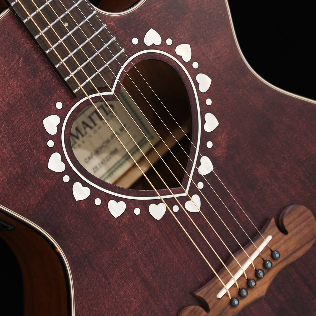 ゼマイティス・アコースティックのオーケストラ・サイズ、アンダーサドル・ピックアップを搭載したエレクトリック・アコースティック・モデルのカッタウェイ・シェイプCAF-90HCWに、パープル・カラーが登場しました。 それぞれアバロン柄とマザー・オブ・パール柄のロゼッタをラインナップしています。 CAF-90HCWは、マザー・オブ・パールのダイヤモンド・インレイが輝く特徴的なヘッドストックを持ったマホガニー・ネックに、ローズウッド・フィンガーボードを採用した20フレット仕様の14フレット・ジョイントとなっています。 ゼマイティスの伝統的なハート型のサウンドホール、その周縁に施されたハートをちりばめたロゼッタ、マスターシュ・ブリッジのオリジナル・デザインは、非常に魅力的です。 トップ・ブレイシングはサウンドホールの形状やボディーのサイズを考慮して、最大限の鳴りを引き出すためにフォワードXブレイシングを採用しています。 ボディー・トップは板材の時に真空状態で熱を加えることで余分な水分やミネラルを取り除いたソリッド・スプルースを使用し、サイドとバックにはサペリを用いて狂いの出にくい安定したボディー剛性を実現しました。 ヘッドストックの突板にはローズウッドを使用し、ペグのボタンはパーロイドを採用しています。 ボディー・サイドには4バンドEQとクロマティック・チューナー機能を持ったプリアンプを搭載し、お好みのトーンでアンプなどの外部機器に出力できます。 ●アンダーサドル・ピエゾ・ピックアップからのサウンドをコントロールするプリアンプ・システム。 コントロールはVolume、Treble、Middle、Bass、Presence。 便利なチューナー機能も装備。 9Vバッテリーを使用。 ●サウンドに広がりを与えるハート形状のサウンドホールと、ハートとドットが交互にちりばめられたアバロン柄のロゼッタ。 ●その形状から、英語で口ひげを意味する「マスターシュ」と命名されたブリッジ。 ●付属ギグバッグは、大きな前面ポケット付き。 ダブル・ショルダー・ストラップ でバックパック・スタイルでの運搬が可能。 SPEC ■Top: Solid Spruce ■Back & Sides: Laminated Sapele ■Bracing: Forward X ■Neck: Mahogany ■Nut Width: 43mm ■Fingerboard & Bridge: Rosewood ■Fretboard Radius: 400mm ■Nut & Saddle: Bone ■Scale Length: 630mm ■Frets: 20 ■Headstock Veneer: Rosewood ■Finish: Satin Urethane ■Body Length: 490mm ■Body Width (Upper Bout): 282mm ■Body Width (LowerBout): 392mm ■Body Depth (Upper): 96mm ■Body Depth (Lower): 108mm ■Preamp: EX-4 with Zemaitis Logo ■Strings: .012 / .016 / .024 / .032 /.042 / .053 [Coated Phosphor Bronze] ■Case: Gigbag |