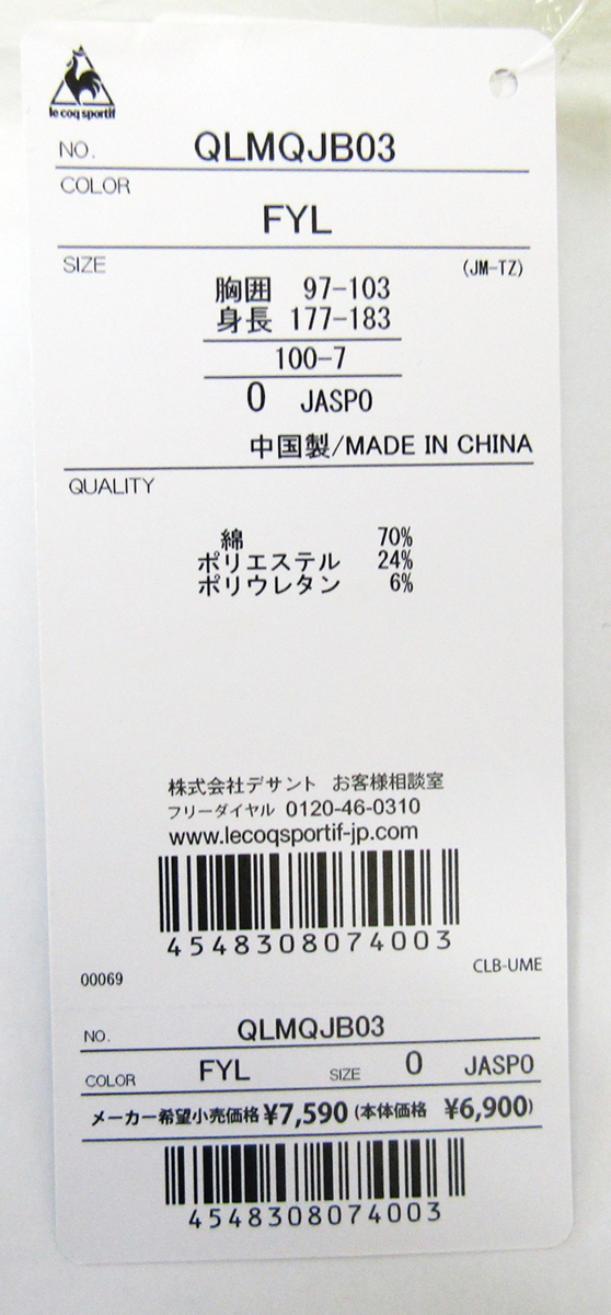 メーカー:ルコックスポルティフ  品番:QLMQJB03