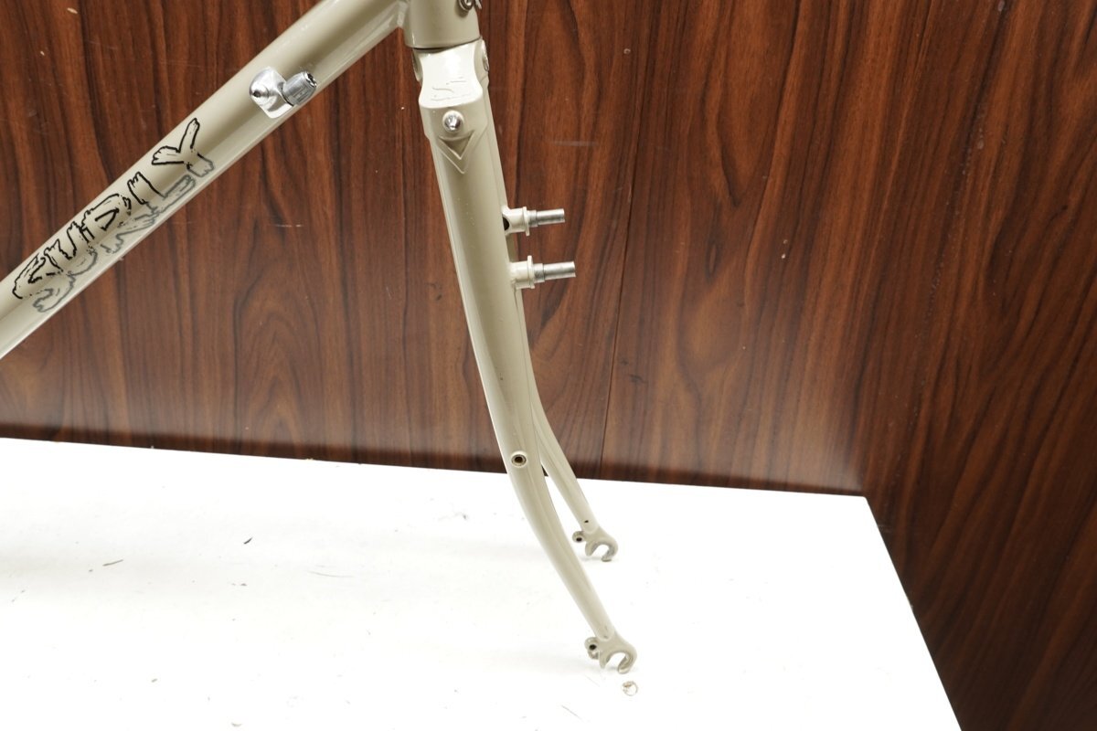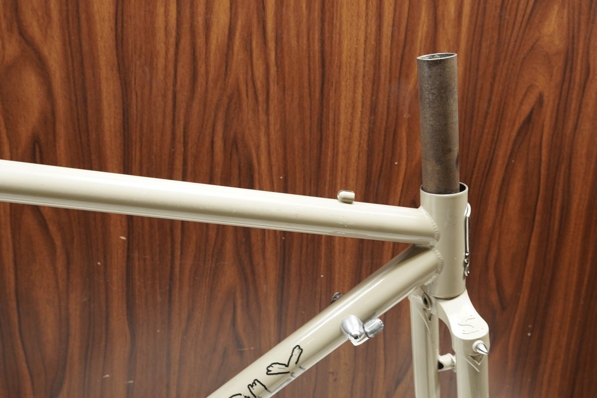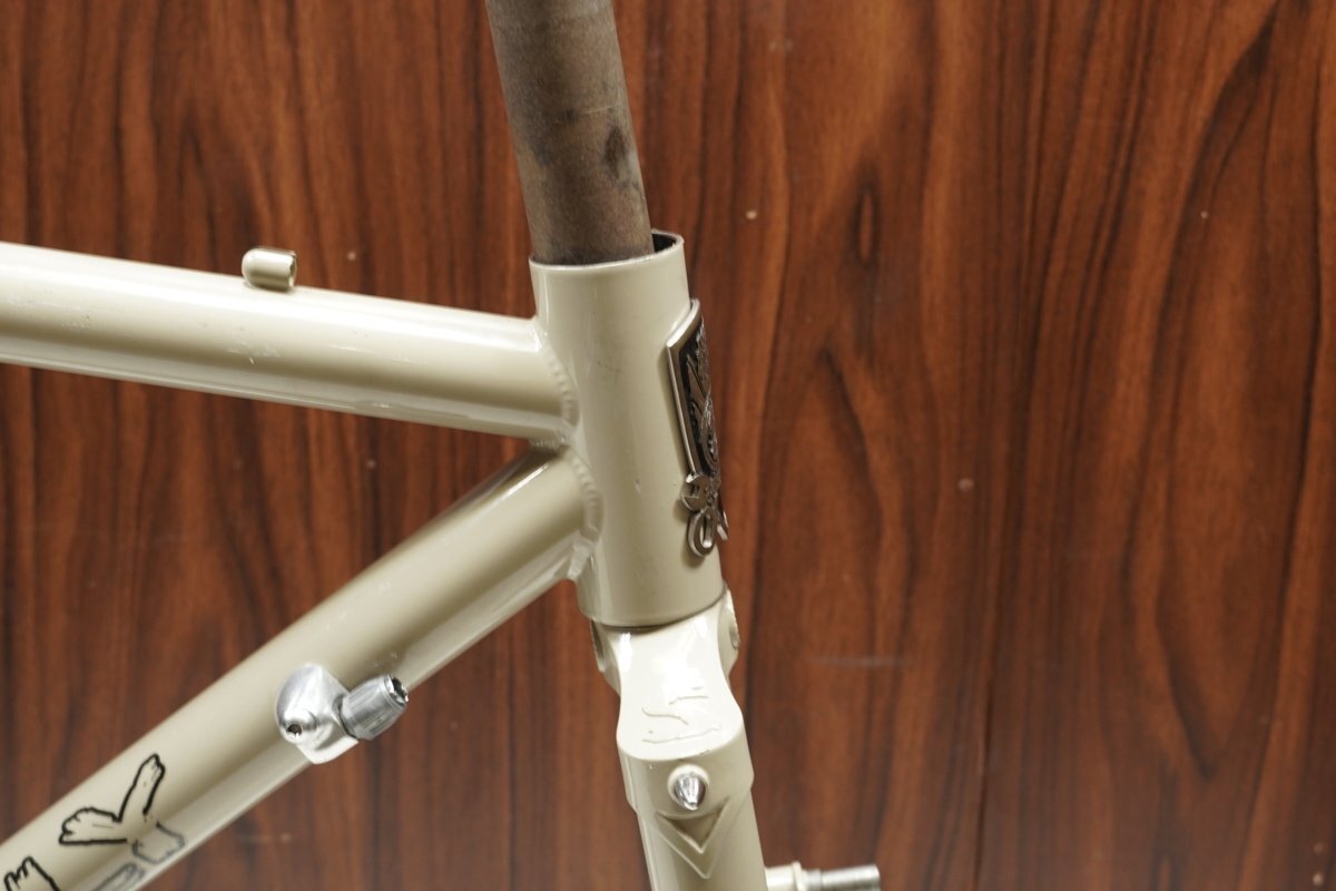 | 仕様 | 年式:不明 (フレームカラーはベージュ系です) フレーム:クロモリ フォーク:クロモリ BB:JIS FDマウント:32mm バンド シートポスト:27.2mm コラム径:OS コラム長:190mm OLD:100/135mm QR サイズ:50 トップチューブ長(C-C):535mm ※ホリゾンタル換算値 シートチューブ長(C-T):500mm ヘッドチューブ長:91mm 適応身長:cm~cm 程度 実測重量(フレーム):2,250g 実測重量(フォーク):1,140g ※掲載画像状態 |