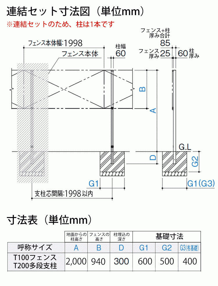 1セット内容 | 連結セット【フェンス1枚、多段支柱1本】 |