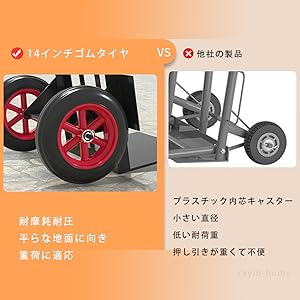 【製品の詳細】質量:約22.5kg。ボディ質量:約16kg。全長:約150cm。荷台寸法:約27×39cm。耐荷重:約650kg。タイヤ:14インチの中実(ソリッド)ゴムタイヤ。タイプ:アングル。 【重荷運搬も楽々】最大限耐荷重を持つキャリーカートは650KGに至るので、ボトルウォーター、