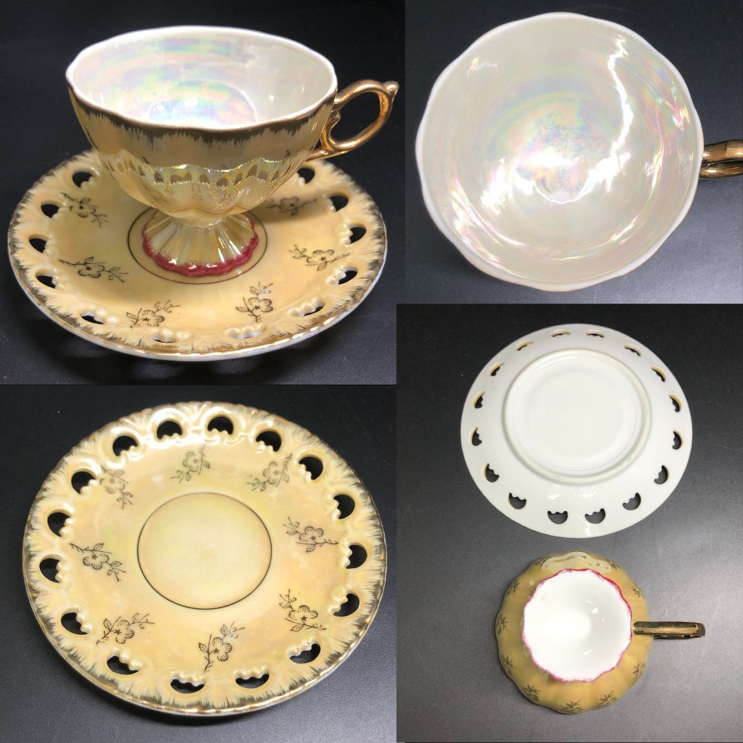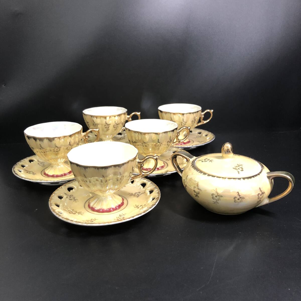【ヴィンテージ】ラスター彩/金彩 ティーカップ&ソーサー メッシュ 5客 シュガーポット 計6点セット