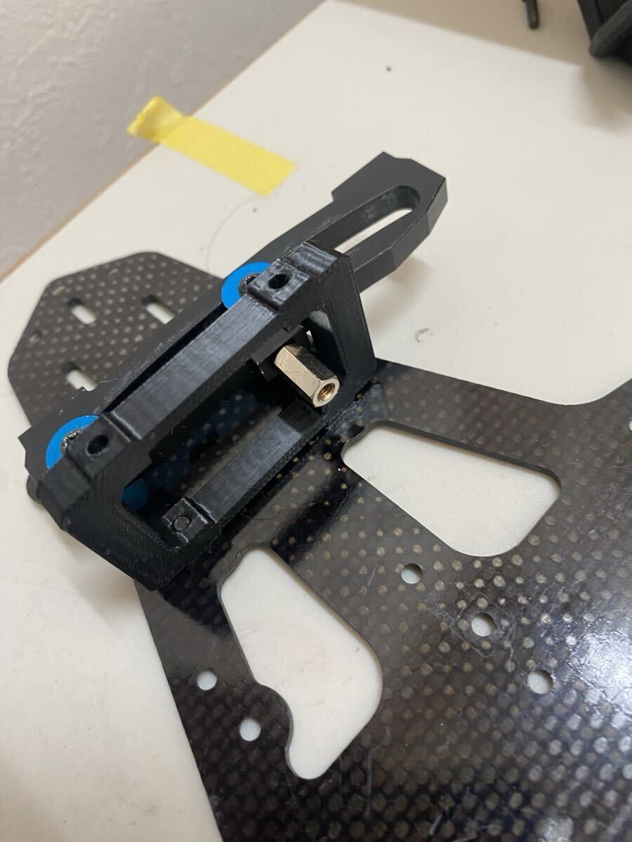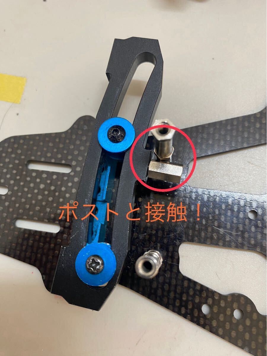 TA04のフロントサスマウントの穴を使いスライドラックステアリング化した場合、オリジナルのポストとスライドラックが微妙に干渉しました。これを回避するための特殊形状のポストです。