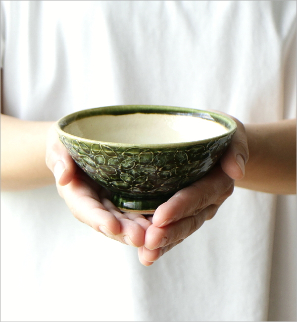 | 瀬戸焼を代表する釉薬の一つ ”織部釉”にイッチン技法で 花模様を描いたご飯茶碗 ろくろで土を重ねた軌跡が 織部の濃淡を生み出し 単色でも抑揚のある雰囲気で 光を受けると僅かに 玉虫色の様な輝きも見られる 綺麗な色合いも魅力です 商品名 : 花飾り 織部 ご飯茶碗 商品番号 : mkn8698 全体のサイズ(cm) : 直径11.8×高さ6(深さ4.5) 重量 : 130g 容量(9分目) : 230cc 使用方法 : 電子レンジ)〇 食洗機)〇 オーブン)× 材質 : 陶器 生産国 : 日本(瀬戸) ※食器洗浄機内に設置する際は、器同士がぶつかると欠けやすい性質がありますため十分にご注意くださいディスプレイによる色の違いはご了承下さい ※ディスプレイによる色の違いはご了承下さい -陶器(土物)の特性とお願い- 土物は同じ技法、同じ窯で焼成しても土や釉薬に含まれる天然鉱物などの影響や天候で焼き上がりは微妙に異なります。工業製品のように同一の物になる事はありません。手作りの不均一性、窯変、釉薬の細かいヒビ(貫入)や垂れ等は、製造元より土物の特性として良品の扱いとなります。 |