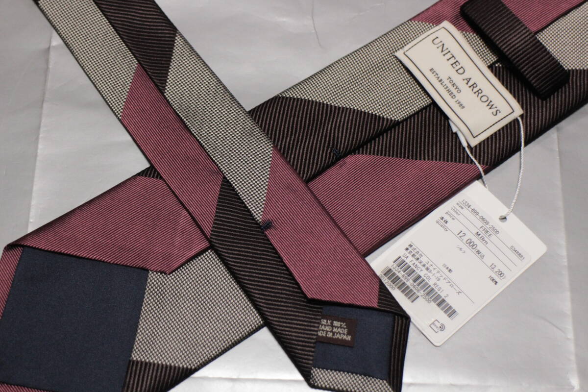 ユナイテッドアローズ新品ネクタイ超華麗艶ピンク*シャンパンシルバー*ブラウンレジメン重厚織柄切返し段落ちワイドピッチハンドメイド