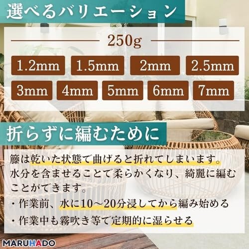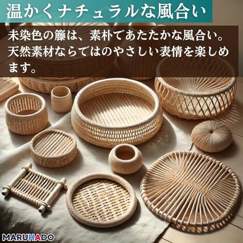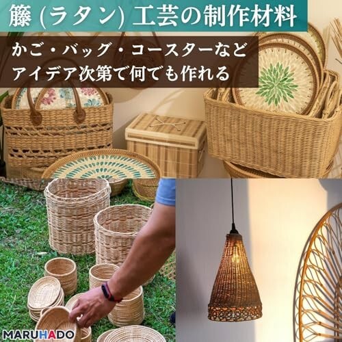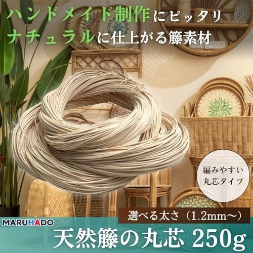 未染色のラタン(籐)丸芯。コースターやかご、バッグ、ランチョンマットなど、幅広いハンドメイド籐工芸に活用できます。自然素材ならではの風合いで、北欧風や和モダンなどのインテリアにもよく馴染みます。