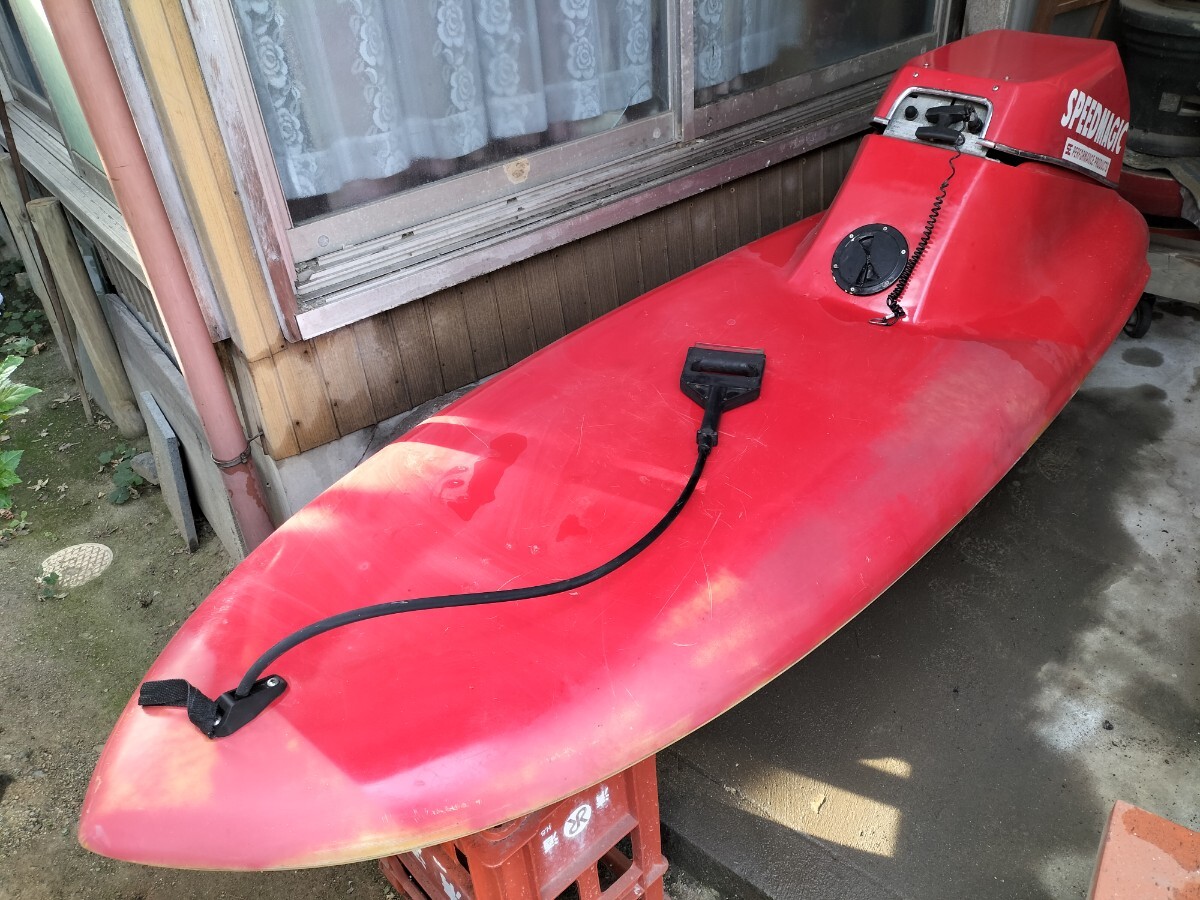 出品しております商品は、サーフボードの中古品となります。商品の状態ですが、かなり前に地元のマリーナから購入して一度だけ乗ってから現在まで保管しておりました。マリーナから購入したので、一度しか乗ってませんが問題なく動いてましたが、それからは写真の場所で保管してましたので現在は動くのか動作確認はしておりません。保管場所は雨や風などしのげる場所なのでエンジンの方も比較的綺麗な状態でした。それと、画像でもありますが、サーフボードでいうフィンが片方折れてありません。書類も画像の通りでこれはマリーナから貰った時からこのような古文書みたいな状態です。又、整備すれば動く可能性は高いと個人的には思うのですが、かなり前の事なので分かりませんが。その事をご理解の上でのご入札よろしくお願い致します。ノークレーム、ノーリターンでよろしくお願い致します。