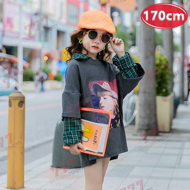 1スタ☆kids タータンチェック シャツ重ね着風 トップス 【170cm】グレー 女の子 ロンT 学生 秋服 長袖 K-418bk