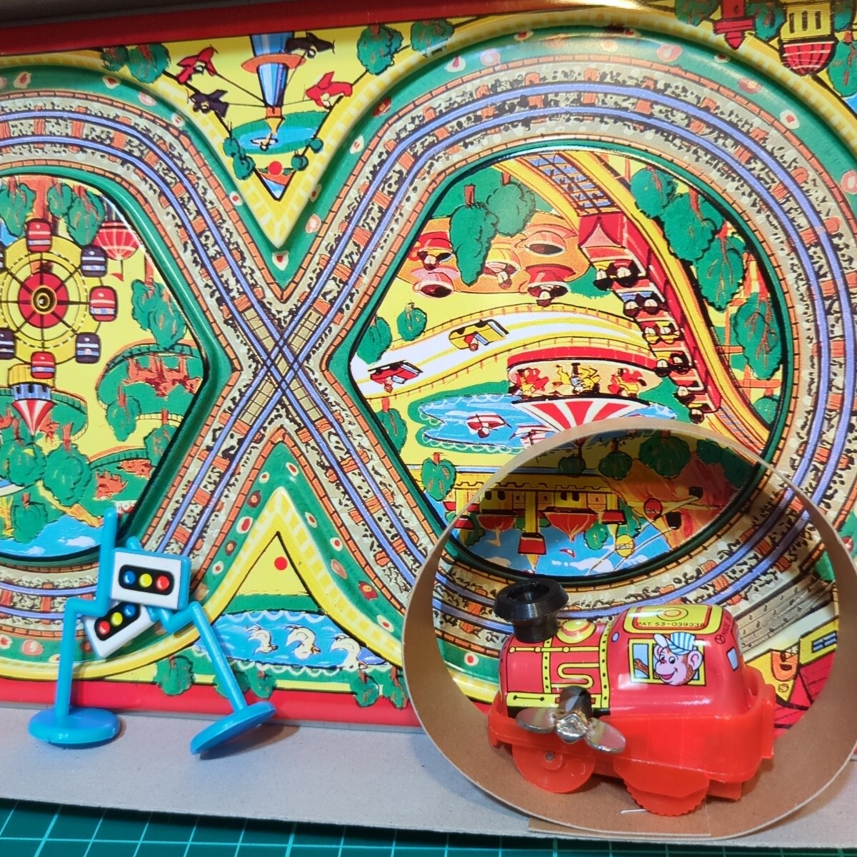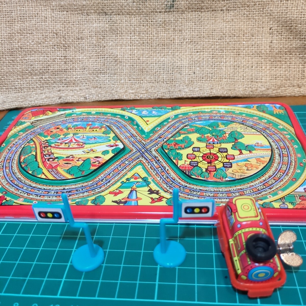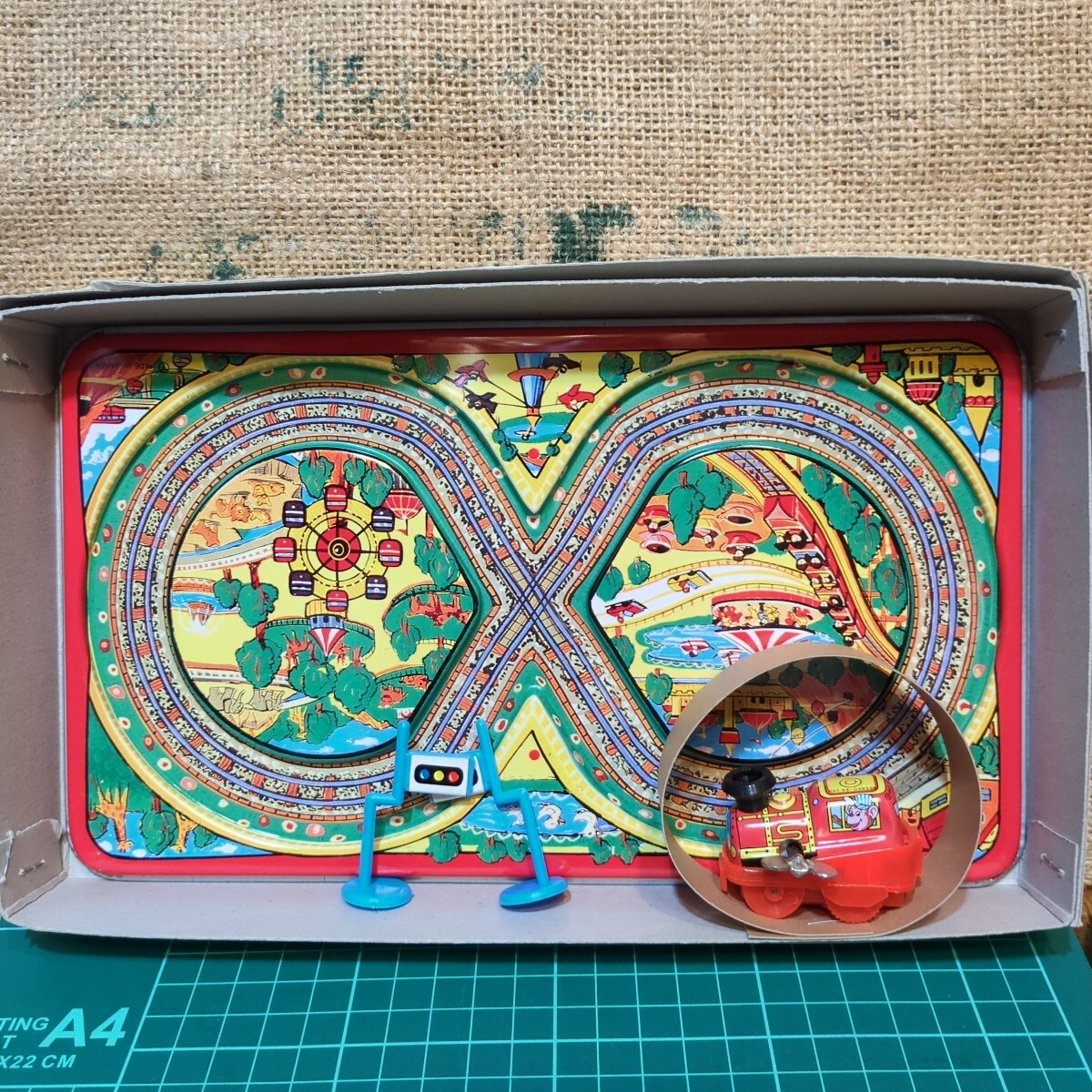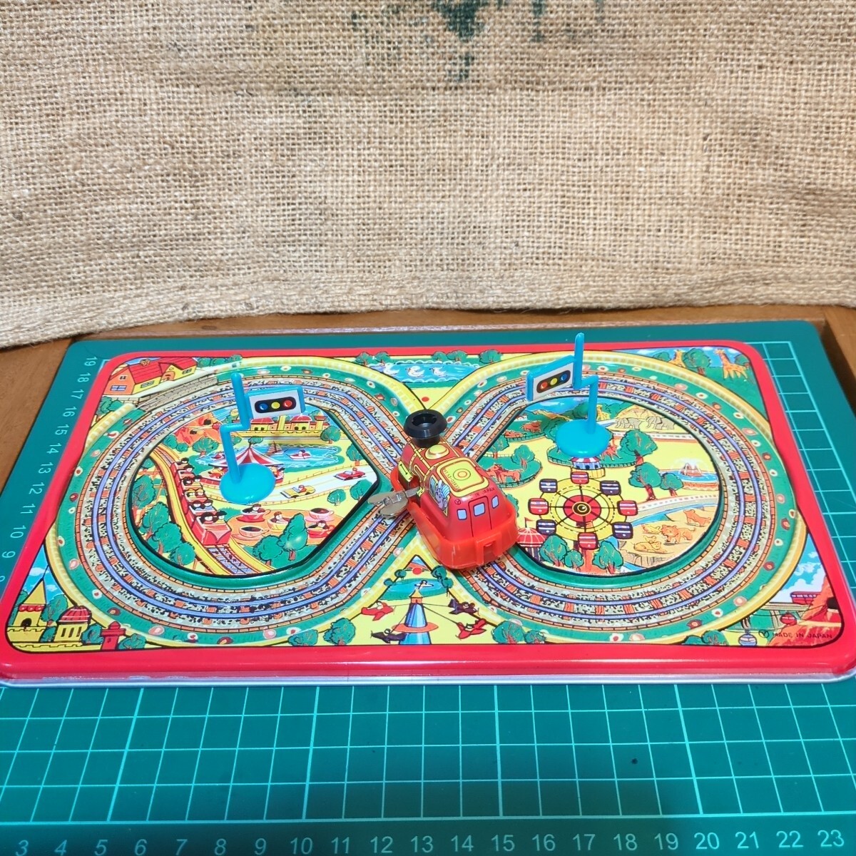三幸製作所製のブリキのおもちゃ「FAIRYLAND TRAIN SET(フェアリーランドトレインセット)」です。ゼンマイ仕掛けの乗り物を無限大の形をしたカラフルなコースプレートの上で走らせて遊ぶレトロな玩具です。