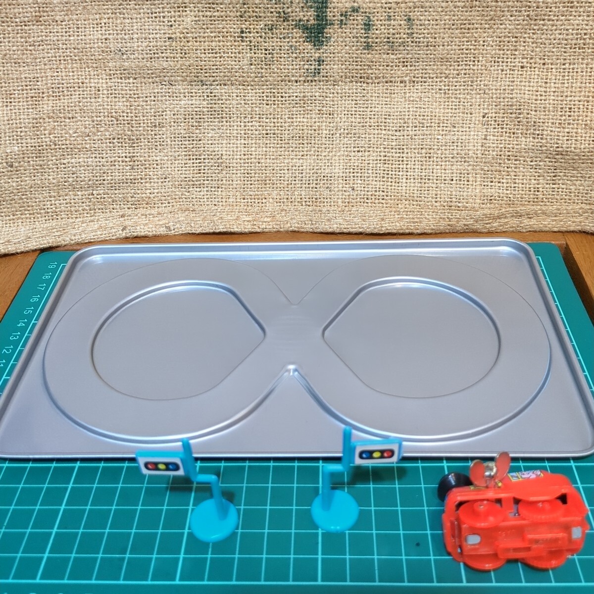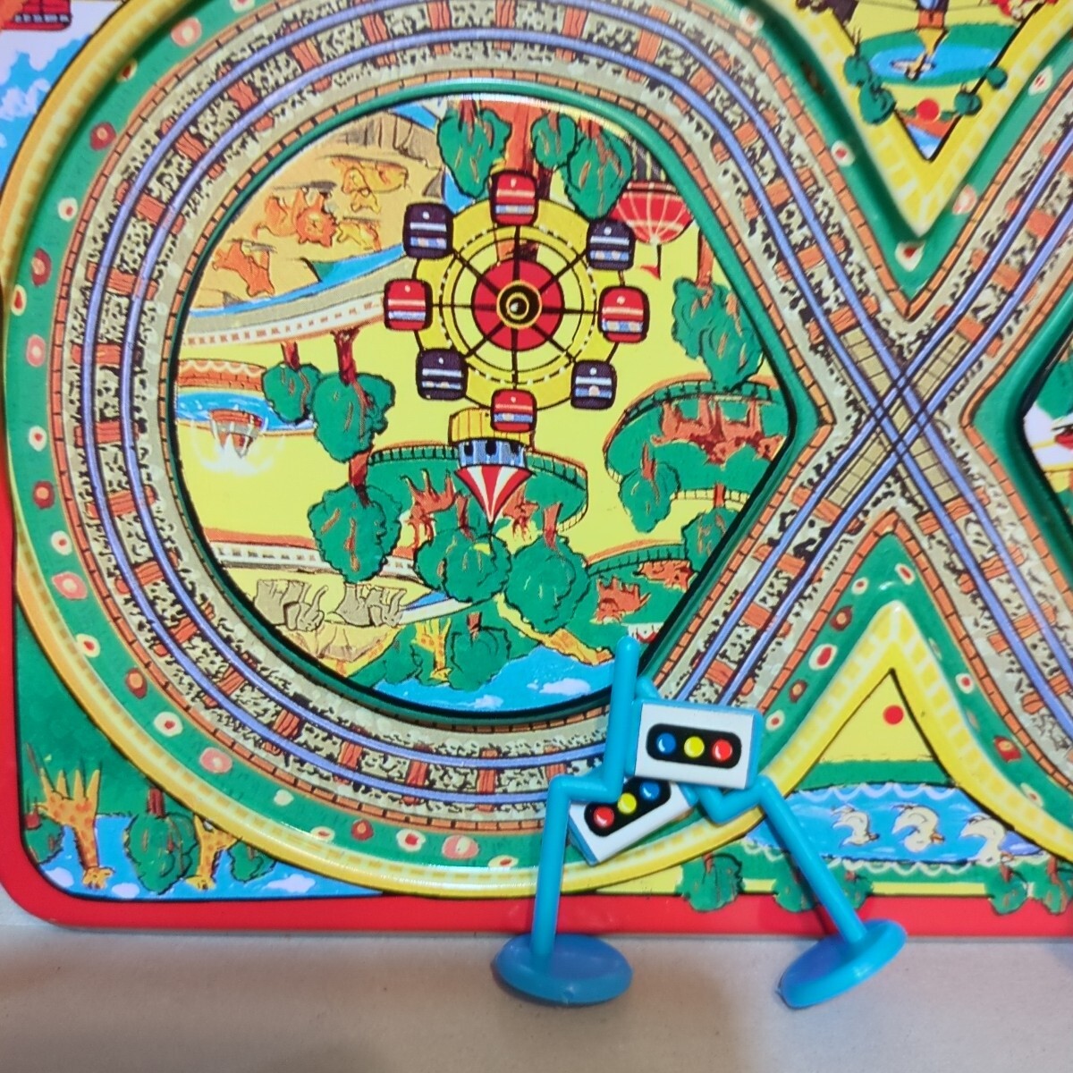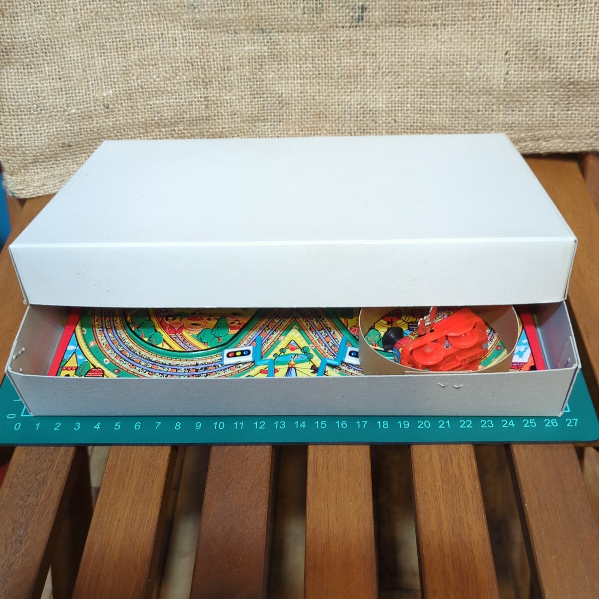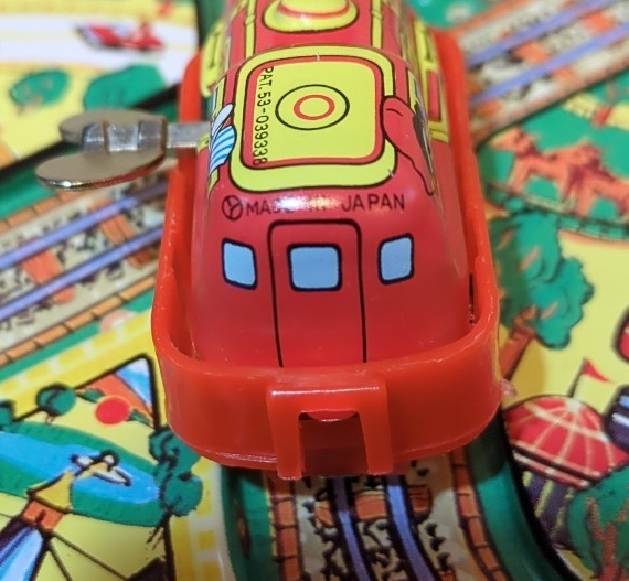 三幸製作所製のブリキのおもちゃ「FAIRYLAND TRAIN SET(フェアリーランドトレインセット)」です。ゼンマイ仕掛けの乗り物を無限大の形をしたカラフルなコースプレートの上で走らせて遊ぶレトロな玩具です。