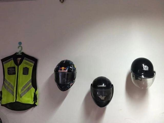 バイク用、自転車用ヘルメットハンガーです。ネジで壁に固定します。普通の帽子ハンガー、ジャケット掛けもできます。バスケットボール、サッカーボール等の球型商品置きとしてもご利用いただけます。