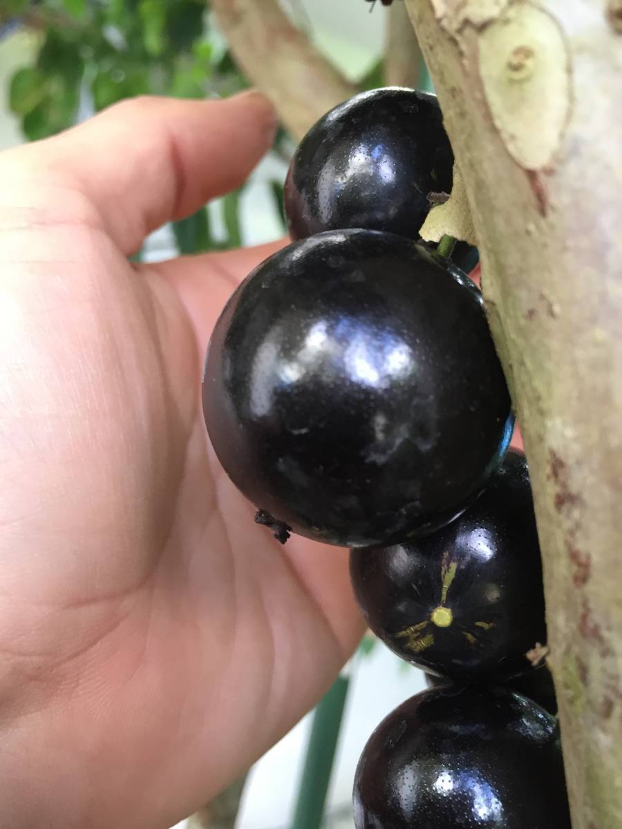 ◎ジャボチカバの果実は木の幹に直接白い花が咲き、巨峰ブド ウのような果実が着く珍しいブラジルの果物です。果実は始め は緑色、熟せば濃褐紫色になり、直径が2~4cmと巨峰ブドウと そっくりになり、味まで似ています。糖度は16~18度あり ます。