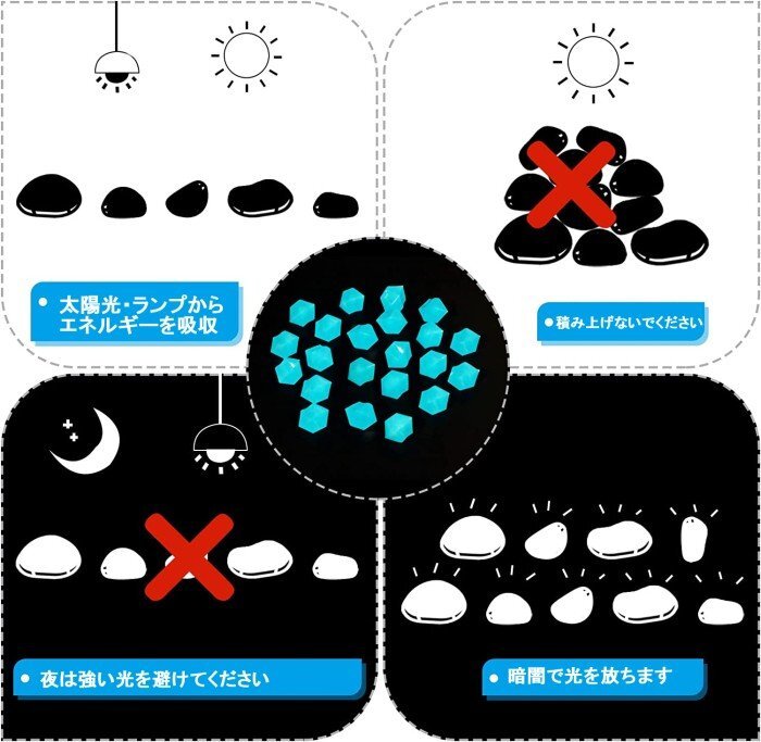太陽光やランプなどのエネルギーを吸収し、暗闇で発光します。