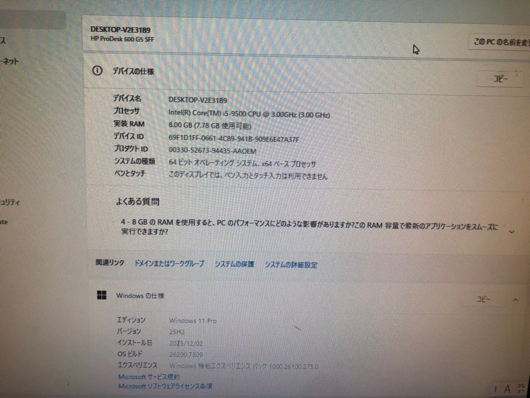 | CPU | Intel(R) Core(TM) i5-9500 CPU @ 3.00GHz | 光学式ドライブ | DVD-ROM(読込) |