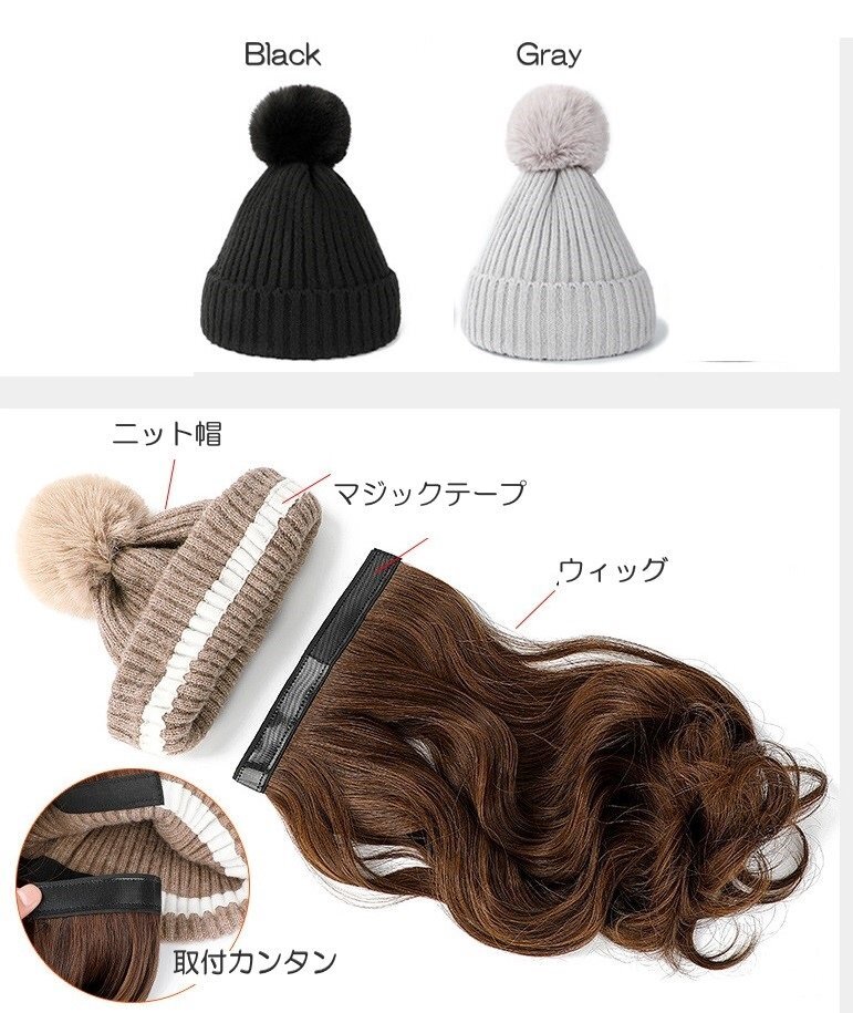 ウィッグ付きニット帽 ニット帽/ブラック ウィッグカラー/C ロングヘアー カール イメチェン 髪色チェンジ コスプレ n467