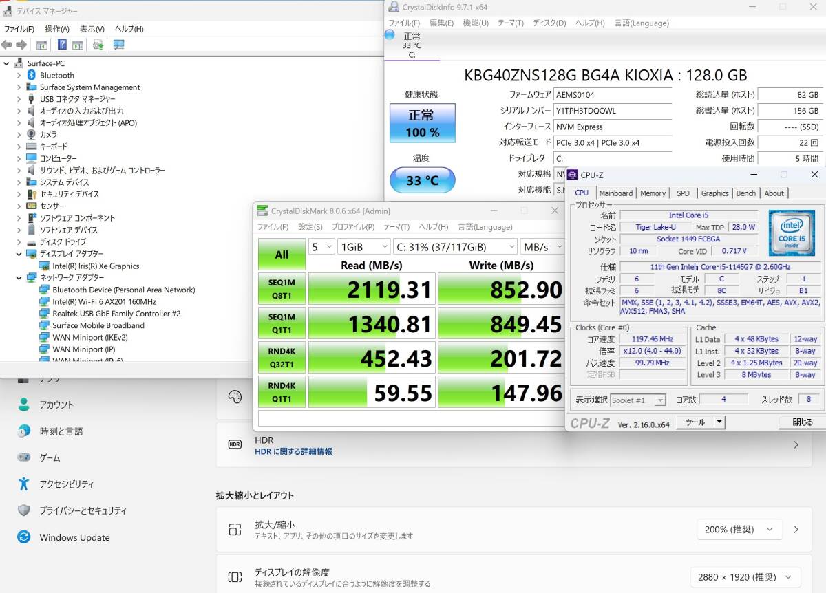 | CPU: 卓越性能 第11世代Core i5-1145G7 2.6Ghz、 4コア8スレッド (ターボ・ブースト利用時の最大周波数 4.4GHz) |