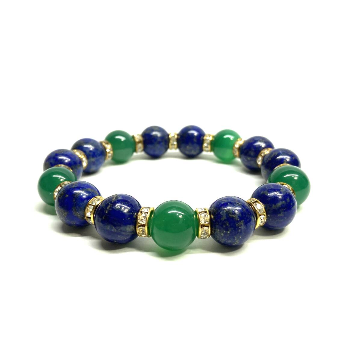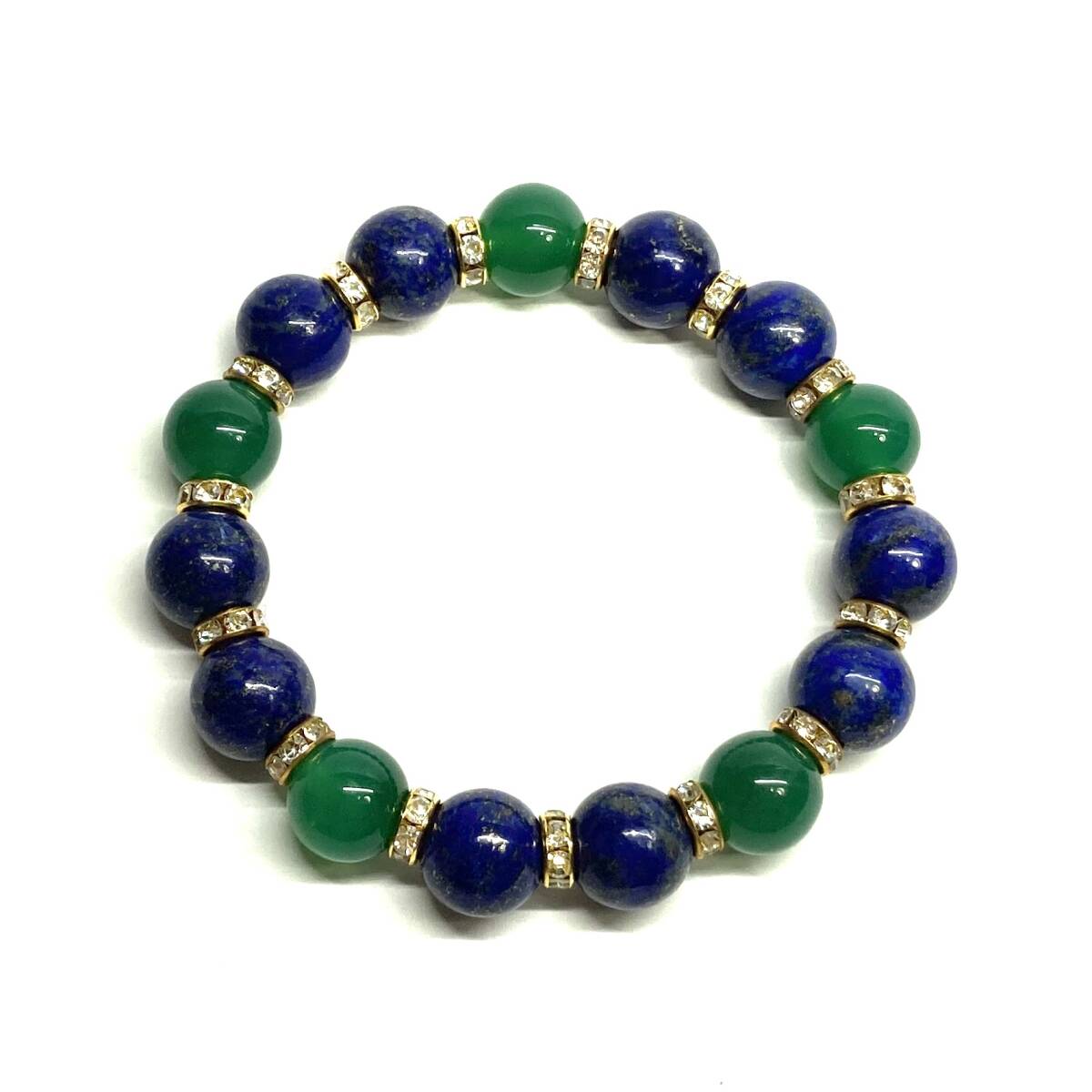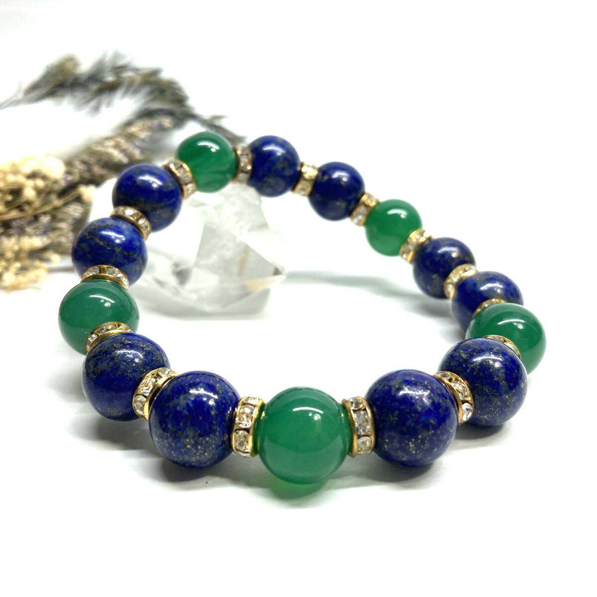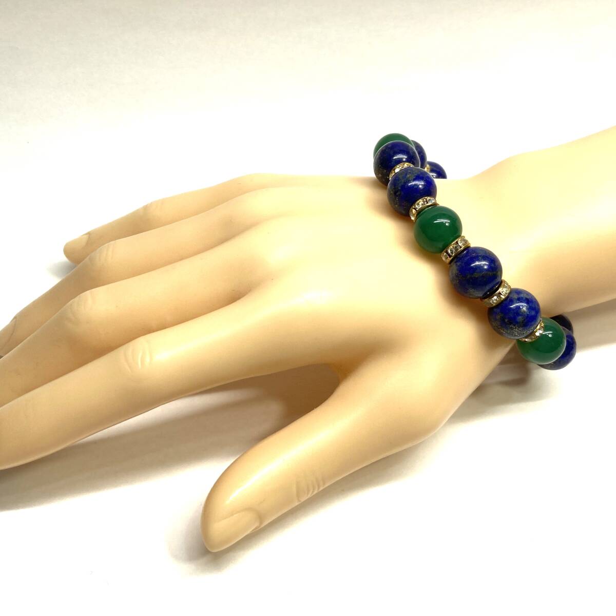 こちらは、ラピスラズリと緑瑪瑙を組み合わせたパワーストーンブレスレットです。間にはロンデルを挟み高級感あるデザインに仕上げております。程よくインパクトがある12mm玉を使用して内周約18cmです。(サイズ変更の場合は取引ナビにてご連絡をお願いします。) 数に限りがございますので気になる方はお早めにどうぞ。