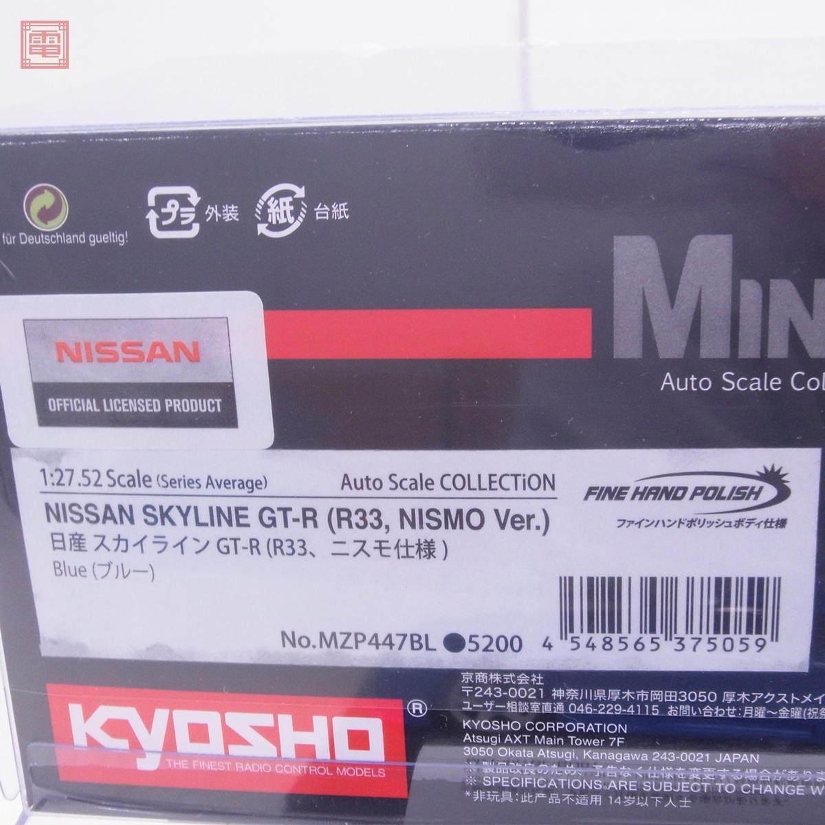京商 ミニッツ 1/27 日産 スカイライン GT-R R33 ニスモ仕様 ブルー No.MZP447BL オートスケールコレクション ■ケースにスレがあります。 ■ボディに塗装浮きがあります。 ■台座に固定されているため、外さずに行える範囲でのチェックを行っています。 ■写真のものが全てです。付属物の有無や状態については写真からご判断ください。 ■付属物については細かいチェックはしておりませんので、万が一、欠品があったり余計な物が入っていたとしてもご了承ください。 ■商品到着後、当店の保証期間中は、商品及び箱や取説、付属品などを1つでも廃棄や破損をしないようにお願い致します。廃棄や破損をした場合、商品に問題があった場合でも対応や返金などの対処ができなくなります。 ■商品によりますが、発売されてから10年以上経過している中古品である事をご理解頂いた上でご入札をお願い致します。なお、新品や美品、また特記事項がある場合は別途明記します。 | |||