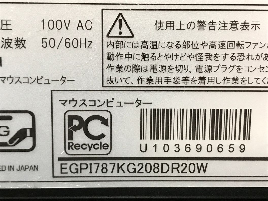 MOUSE COMPUTER/デスクトップ/SSD 480GB/第8世代Core i7/メモリ8GB/8GB/WEBカメラ無/OS無