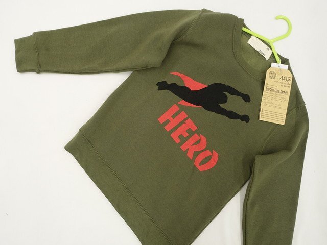 長袖 クルーネック 裏起毛トレーナー 140 グリーン地 ブラック 人間&レッド 英字プリント