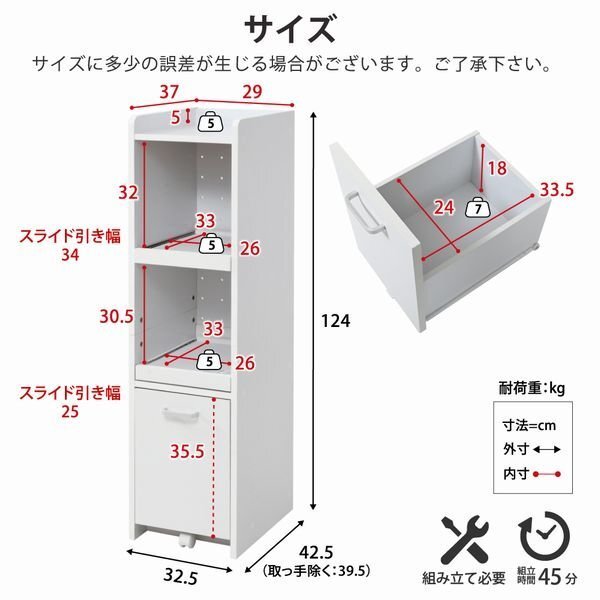 | 【カラー】 ホワイト、ホワイト×ダークブラウン 【サイズ】 <外寸> 幅32.5×奥行42.5×高さ124cm <内寸> スライド部1段目:幅26×奥行33×高さ32cm スライド引き幅1段目:34cm スライド部2段目:幅26×奥行33×高さ30.5cm スライド引き幅2段目:25cm 引き出し:幅24×奥行33.5×高さ18(有効35.5)cm 【材質】 本体:プリント紙化粧合板 天板・前板・スライド棚:合成樹脂化粧合板(PVC) 【耐荷重】 天板:(約)5kg以下 スライド棚:各(約)5kg以下 引き出し:(約)7kg以下 【生産国】 中国 【梱包】 サイズ:75.5×43.5×23cm、重量:21kg 【その他】 ・背面化粧有り ・キャスター1個 ・合計1500wの2口コンセント付き(コード長さ194cm) 【組み立て品】 お客様による組み立てが必要です。 【ご注意】 ・サイズ、重量は概算です。 ・商品カラーはご使用のモニターによって実際の明るさや色と異なって見える場合がございます。 |