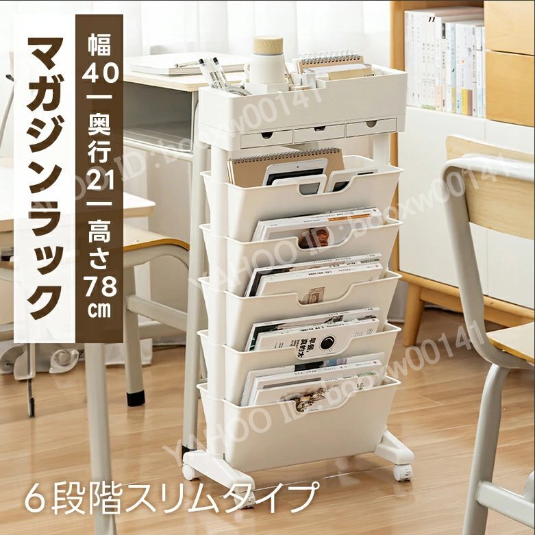 マガジンラック 6段階スリムタイプ 省スペース キャスター付 大容量 オープンラック 工具不要 本 雑誌 書類収納ラック 雑誌 ファイルワゴン ロック機能付き ブックスタンドラック 簡単組み立て