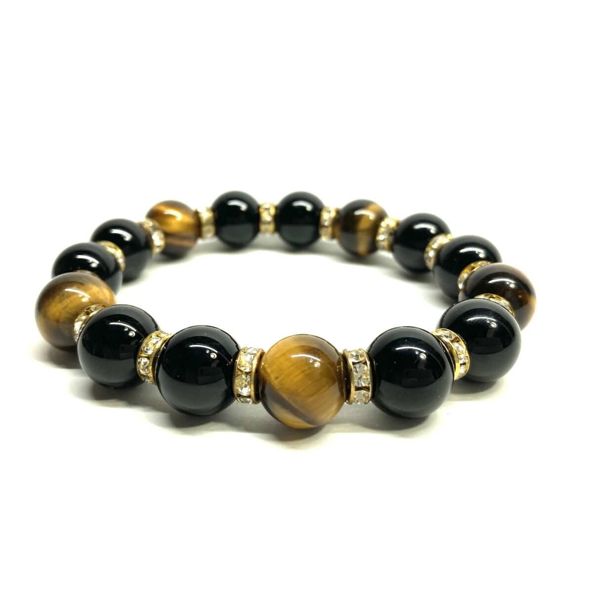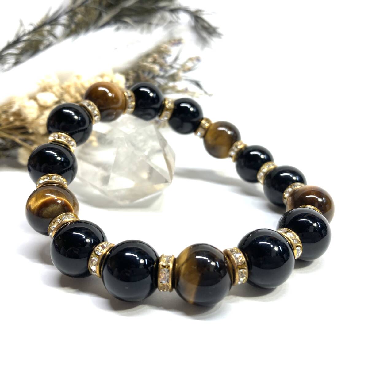 モリオン&タイガーアイ パワーストーン ブレスレット 天然石ブレス (ゴールド) 12mm 幸運 開運 メンズ 男性