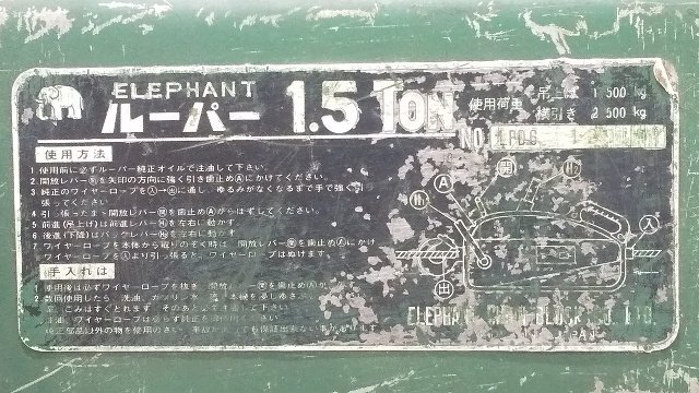 | 商品説明 | (1円スタート!) ELEPHANT エレファント 象印 チルホール ルーパー1.5Ton 手動ウインチ ワイヤー付き 動作良好 B4146[21-1-1-A]:931727 |