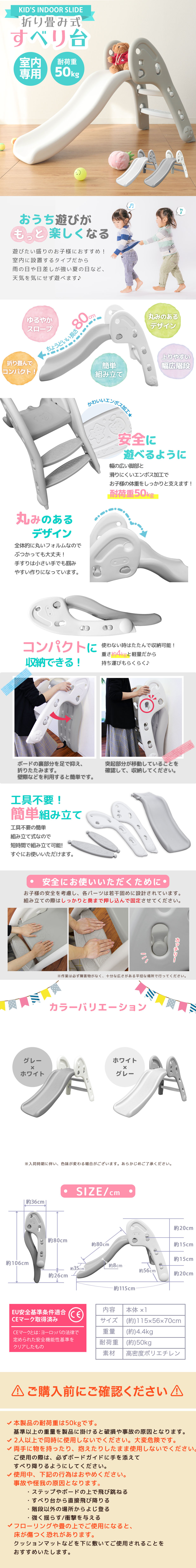 いつでも遊べる!折りたたみ式すべり台です。 お子様が使うには十分な耐荷重50kgと、安心して遊ばせることができるアイテム!! お家の中で遊ぶことができるので、夏の強い日差しや梅雨の時、冬の寒い日などを気にせずに、 一年中いつでも元気に遊ぶことができます。 差し込む・引き上げ・はめ込むだけの簡単組立! 工具は一切必要ありません。 使わないときはカンタン一押しでコンパクトに収納! 移動やお掃除もラクラク♪ 誕生日プレゼント・クリスマスプレゼントにもおすすめ☆ 【商品仕様】 カラー:ホワイト×グレー サイズ(約):115cm×56cm×70cm 材質:高密度ポリエチレン 重量(約):4.4kg 耐荷重:50kg 対象年齢:3才~6才 【注意事項】 ・必ず保護者のもとでご使用し、お子様の行動には十分ご注意ください。 ・屋外でのご使用には一切責任を負いかねます。予めご了承ください。 ・耐荷重以上の重量を製品にかけると破損や事故の原因になります。 ・大変危険ですので、2人以上で同時に使用しないでください。 ・折りたたむ際は、指を挟まないようにお気を付けください。 ・ラッピングは承っておりません。 ・海外製品のため梱包や輸送による本体の細かな傷や擦れ・汚れがある場合がございますのでご理解、ご了承ください。 ・商品は、モニターによって色合いが異なって見える場合があります。 |