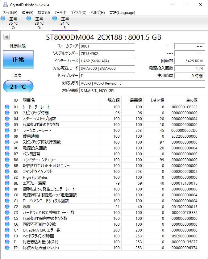 HDD 8TB 使用時間0時間 3.5インチハードディスク / Crystal DiskInfo 正常 / #482 / Seagate / ST8000DM004-2CX188