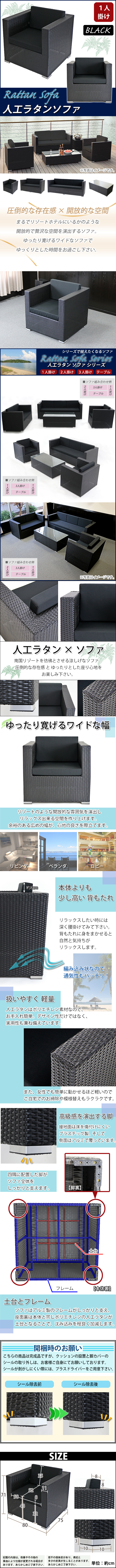 | 商品名 | 新品 人工ラタンソファ 1人掛け 黒 シングルソファ 1P 籐 家具 ファニチャー インテリア おしゃれ リビング sofa ソファー 椅子 チェア 南国 アジアン バリ風 リゾート ホテル ベランダ バルコニー テラス 庭 ガーデン ラタンチェア 1seater ブラック rattan641pbk |