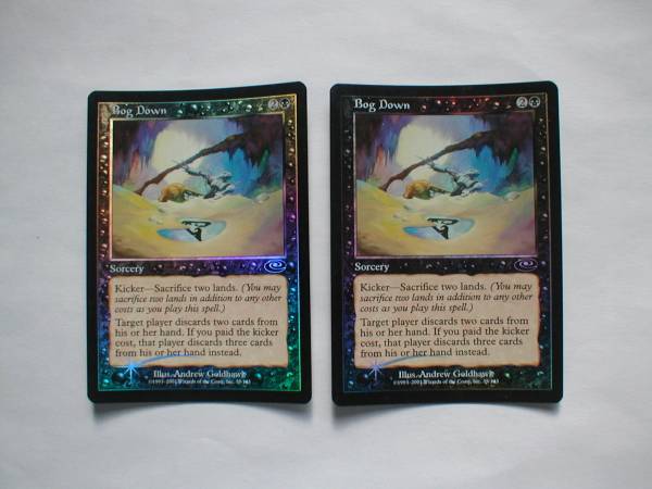 B知人の委託品です。 画像が全てです。 MTG 泥中/Bog Down foil 英語4枚です。 何語だか分らない時があります。 エキスパンション、外国語(言葉)は画像で確認をお願いします。 カードはプレイしてます。 程度はカードに目立つ擦り傷、傷、シワ、折れ目、ペン跡のようなキズ、汚れ、角や端に傷、黒枠にキズ、などのキズが結構あります。 カードからタバコ、香水の匂いがします。 カードが丸まっていたり反ってたりしています。 気が付かない部分がありますので程度を気にする方は入札をご遠慮下さい。 程度は下、ボロです。 コレクションには向きません。 何か起きた場合には自分では対応が出来ませんのでご理解頂ける方のみ入札をお願いします。 普通郵便、クロネコメール便で発送します。 郵便事故や郵便破損が起きた場合には保障できません。 ノ-クレーム、ノーリターンでお願いします。