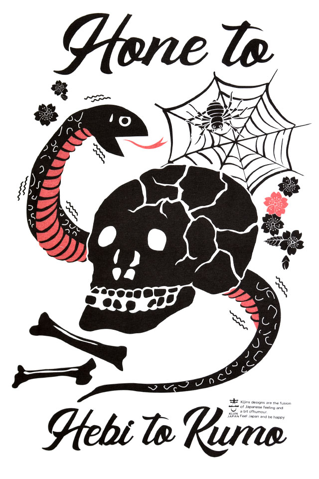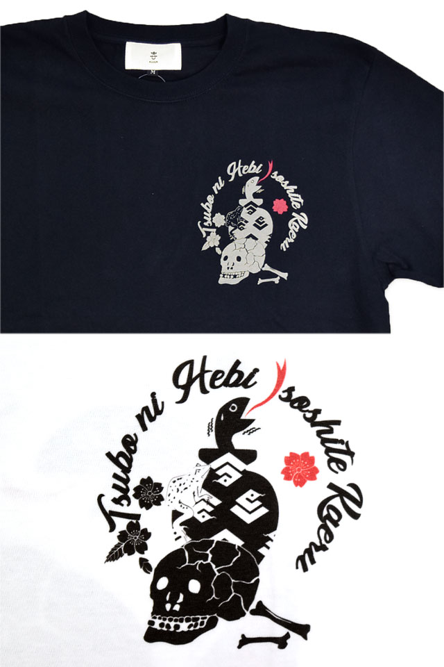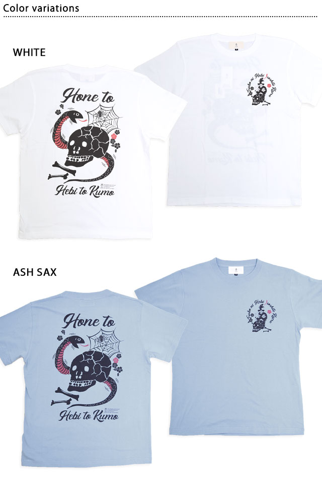 着た人、それを見た人が笑顔になれる、他にはないデザインを提供し続けている「喜人」さんから「骨と蛇とクモ半袖Tシャツ(KJ-52003)」のご紹介です。 スカジャンの代表的な柄の一つである、骸骨と蛇の柄のオマージュTシャツです。 喜人的にはちょっと怖い図案だったので、蛇ちゃんがとても小心者という設定でデザインしました。 背中にいるのは、骸骨に絡み付きながらもビビって何も出来ない蛇ちゃん。 さらに蜘蛛にも睨まれ、ドキドキが止まりません。 フロントには、ビビった蛇ちゃんがツボに逃げ帰るも、今度はカエルに睨まれてさらにビビっちゃっています。 そんな可愛らしい蛇がいたって良いじゃないかというデザインです。 蛇ちゃんのなんともいえない表情が堪りませんね。 袖にはピスネームが縫い付けられています。 | ||||||||||||||||||||