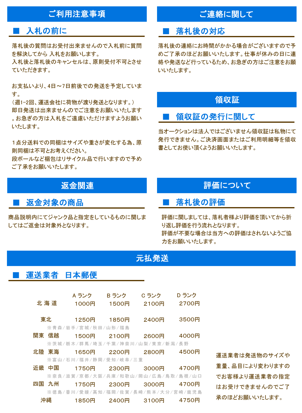 | 運送業者は落札者様からのご指定はお受けできませんので予めご了承くださいませ。 | ||